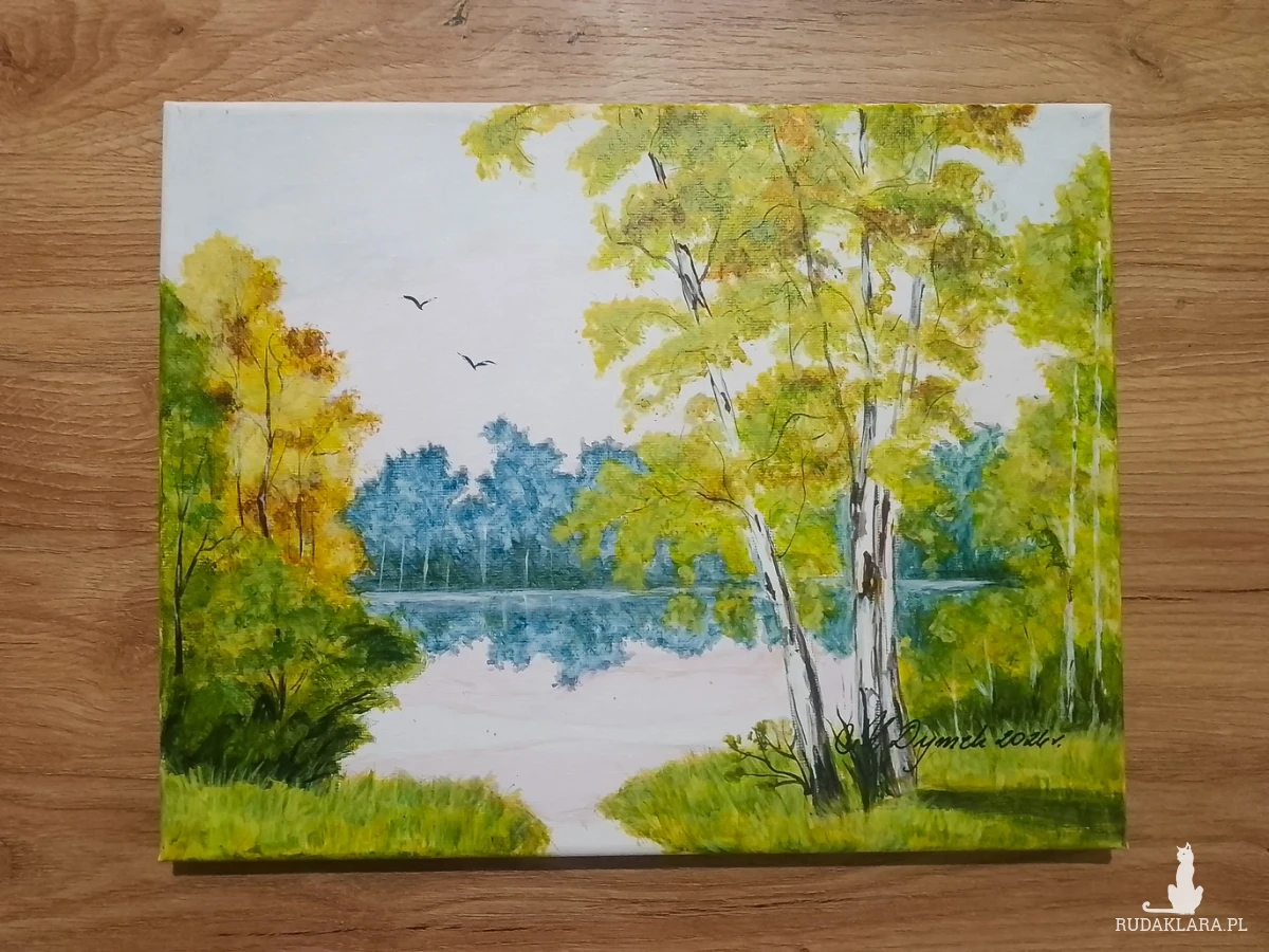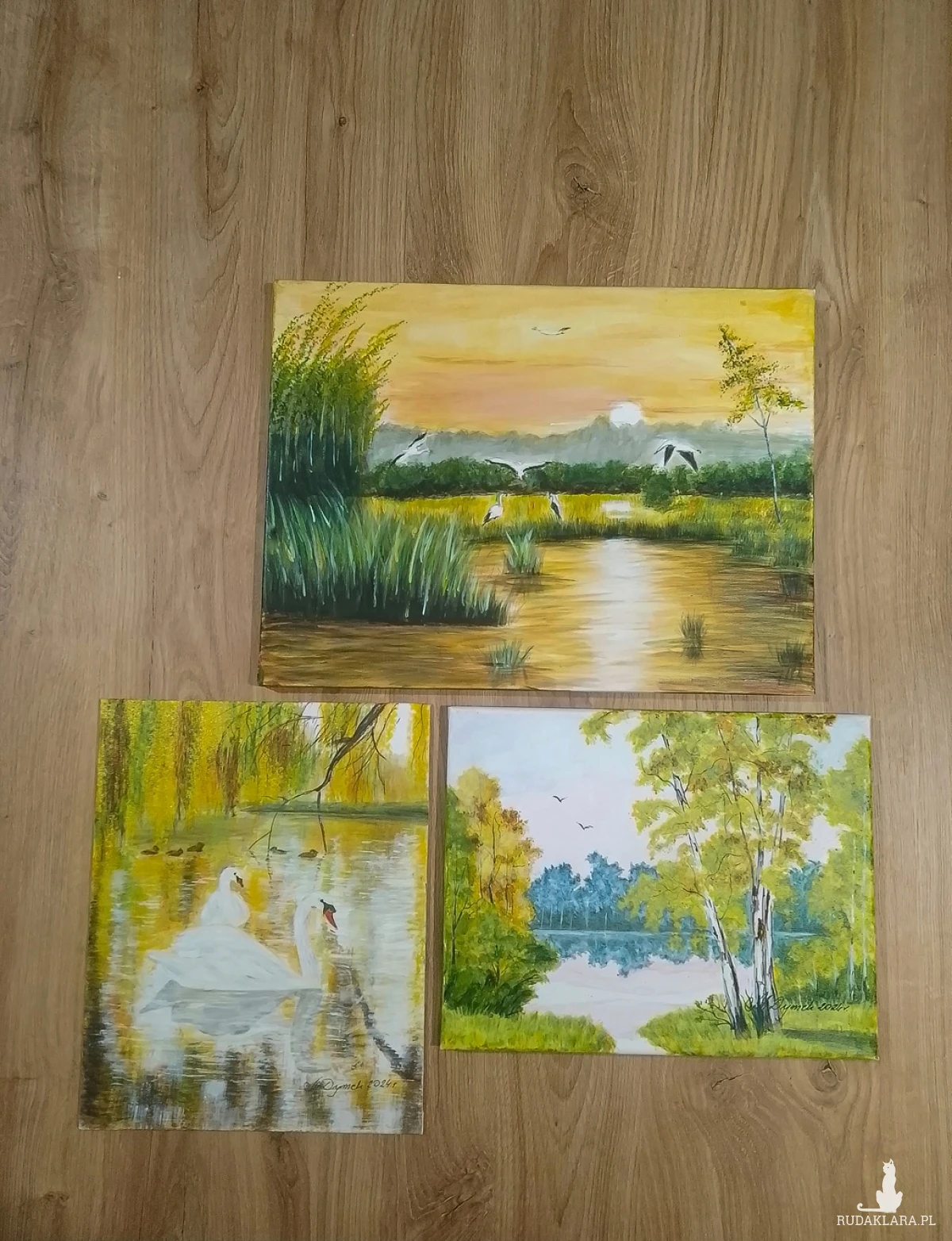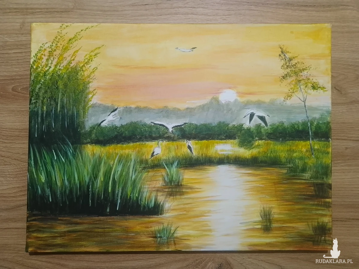 - Tematyka: Malownicze mokradła o zachodzie słońca, brzozowy gaj nad jeziorem, spójny motyw ptaków
