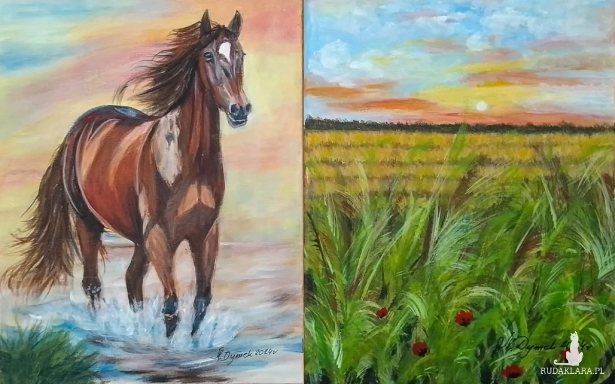 - Tematyka: Sielski widok makowej łąki, zachód słońca, galopujący koń