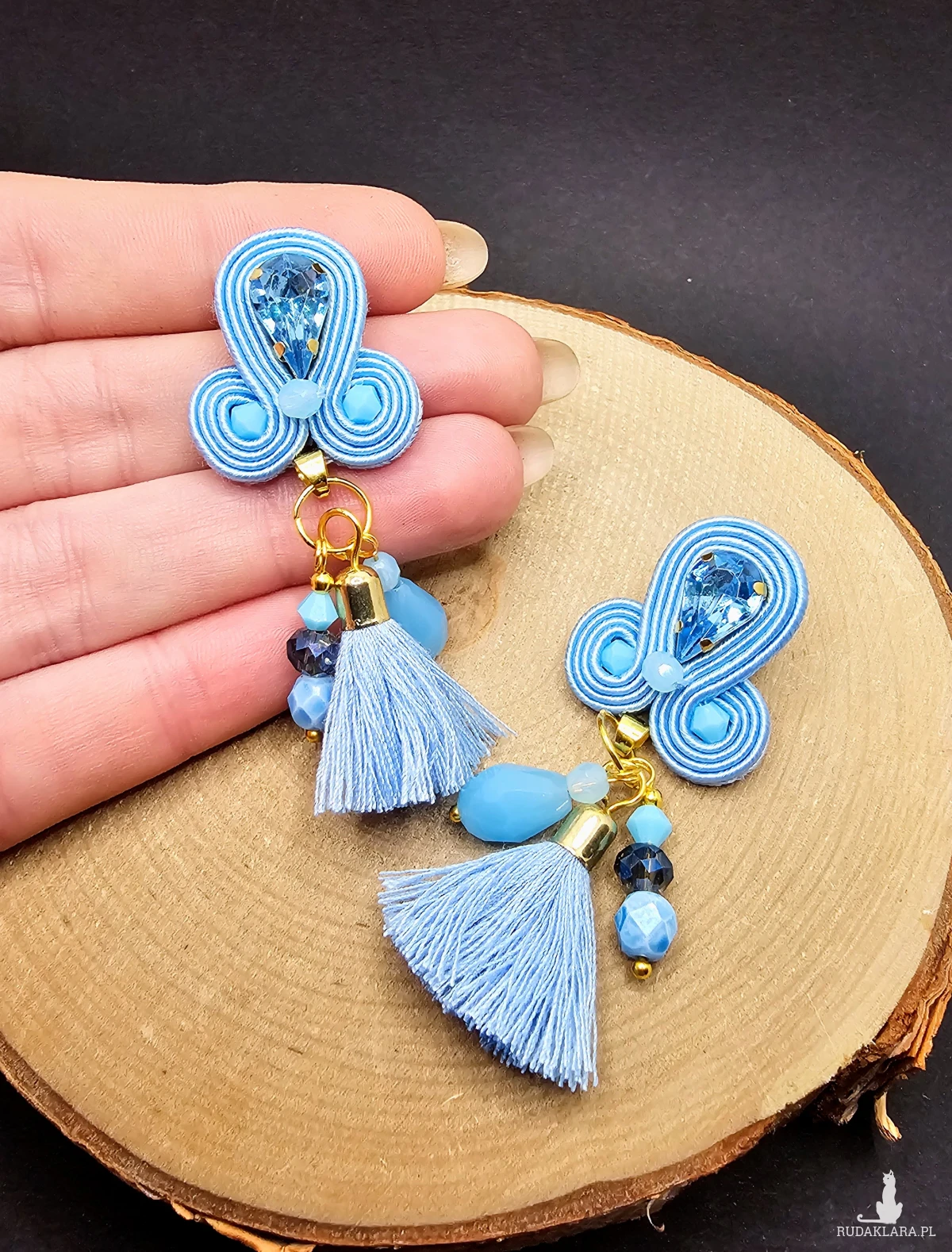 Fasetowane szklane kryształki w złotej oprawie otoczone sznurkami sutasz oraz szklanymi czeskimi koralikami. Dół kolczyków zdobią zawieszki z wiszących chwostów oraz szklane kryształki i koraliki. Kolczyki zamocowane na metalowych sztyftach w kolorze złotym.