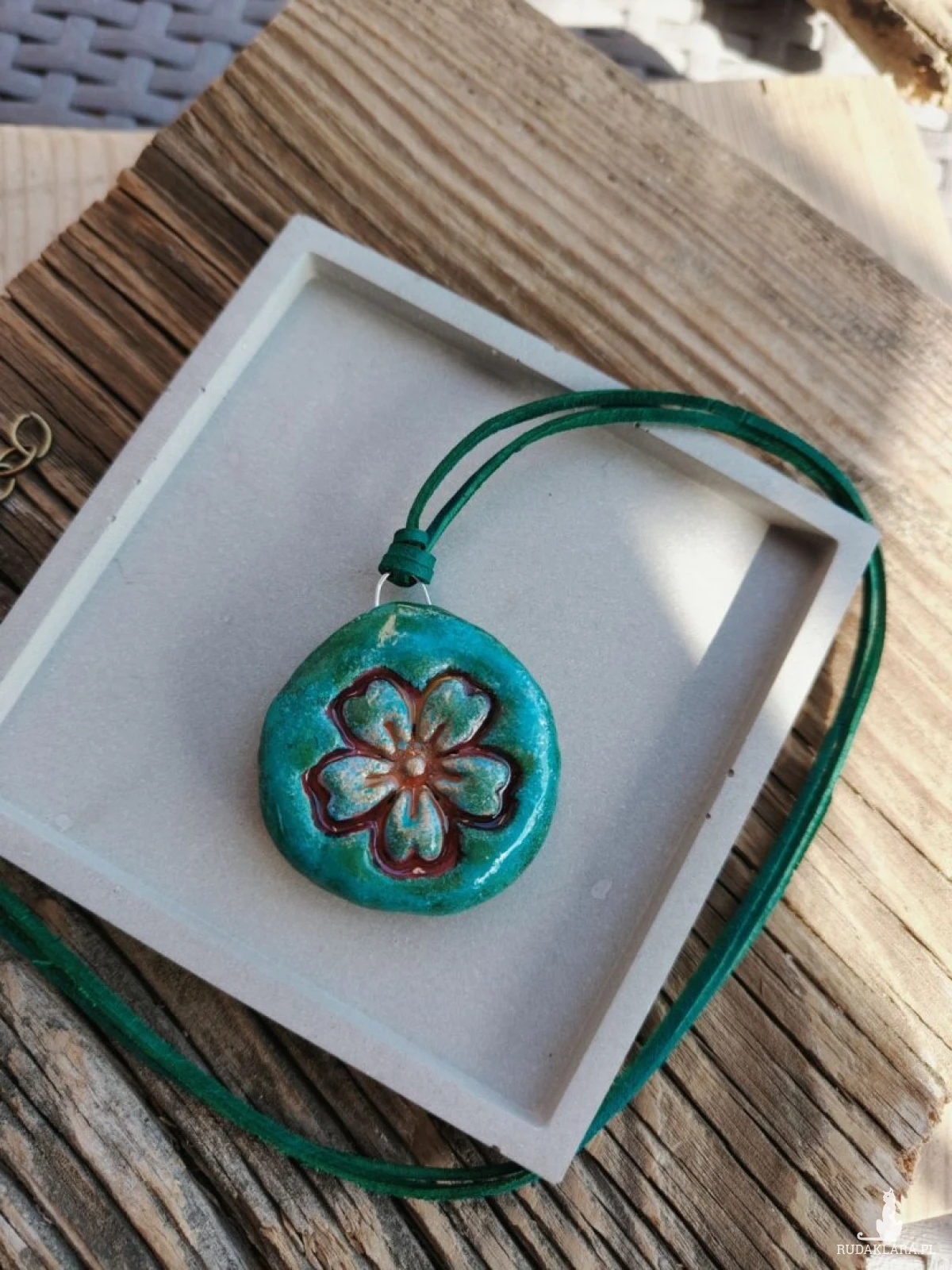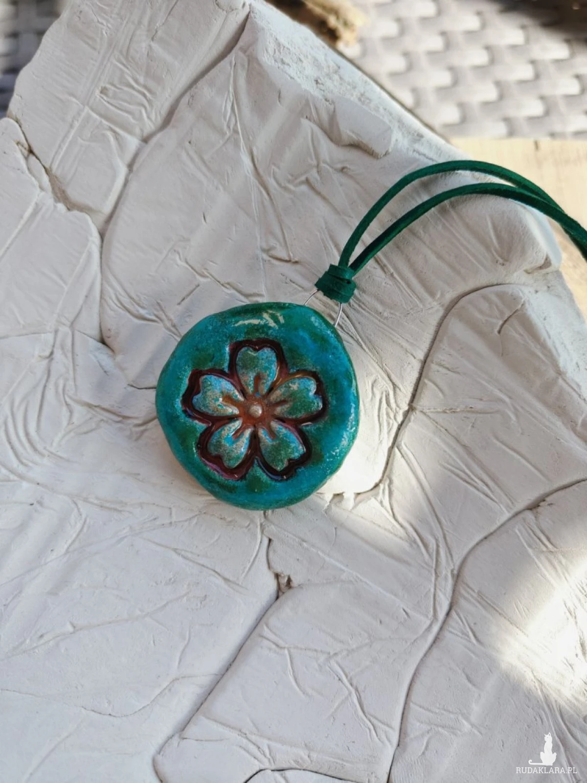 Unikatowa zawieszka wykonana ręcznie z glinki i malowana z dbałością o każdy detal. Delikatny motyw kwiatu w odcieniach zieleni nadaje jej naturalny, leśny charakter. Każdy egzemplarz jest jedyny w swoim rodzaju, dzięki czemu nosisz biżuterię, której nie ma nikt inny. Subtelny połysk pięknie podkreśla reliefowy wzór kwiatu, a zielony naturalny rzemyk idealnie komponuje się z kolorystyką zawieszki. To doskonały dodatek dla osób ceniących rękodzieło, naturę i oryginalny styl.