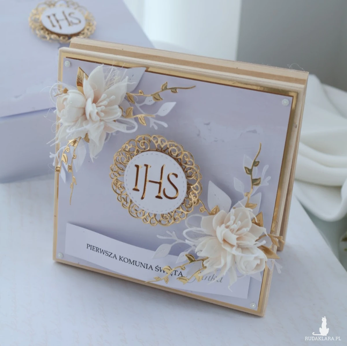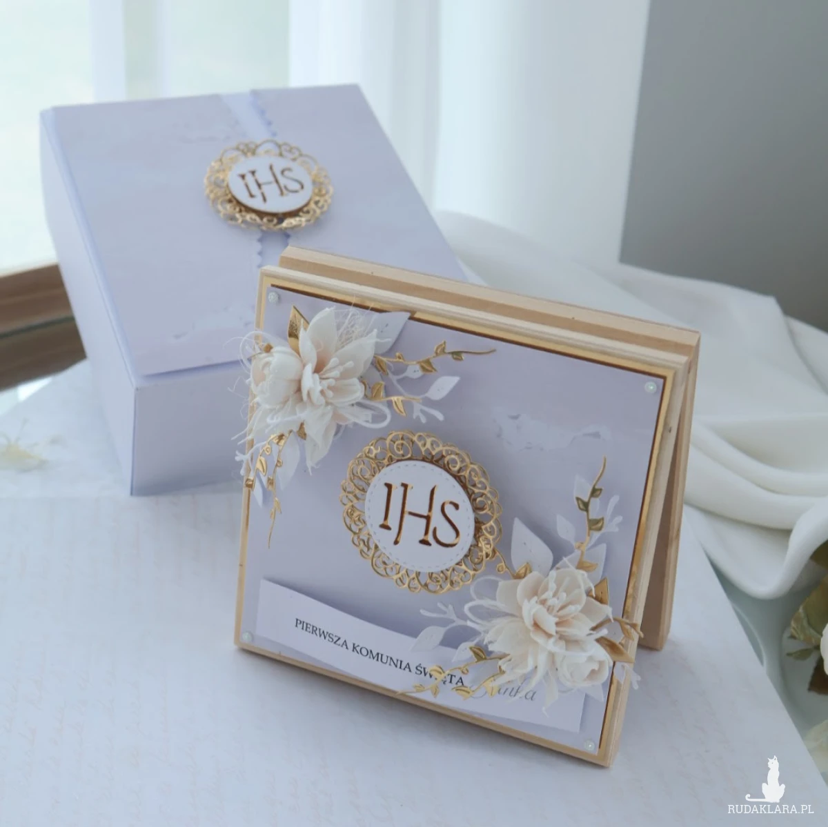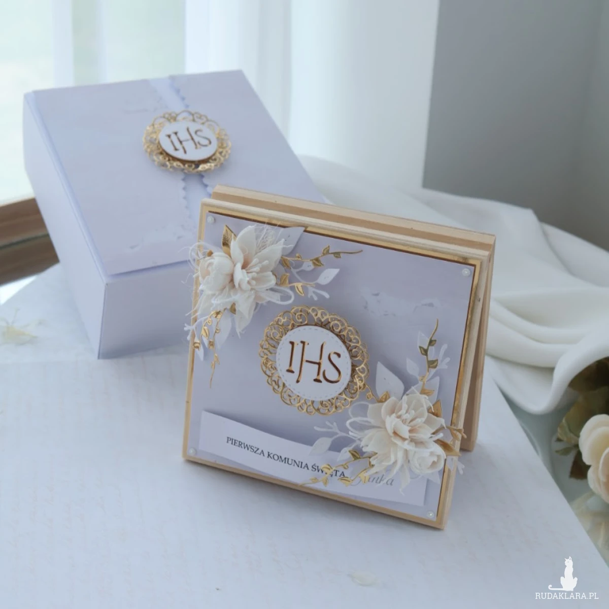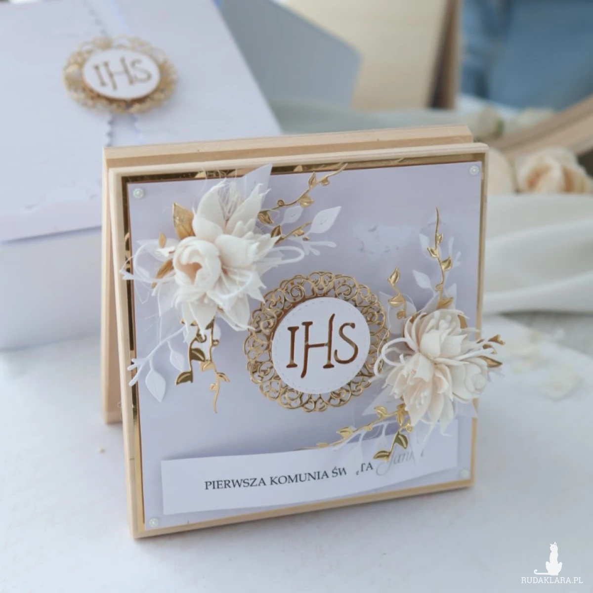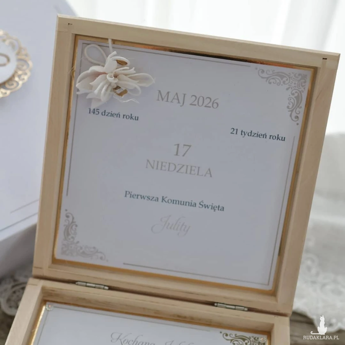 Personalizowana pamiątka Pierwszej Komunii Świętej w drewnianym pudełku to elegancki prezent, który zachwyci i będzie piękną pamiątką. W środku znajdują się życzenia - możesz wybrać tekst taki jak na zdjęciu lub dodać własny, kieszonka na pieniądze oraz kartka z kalendarza lub zdjęcie dziecka.