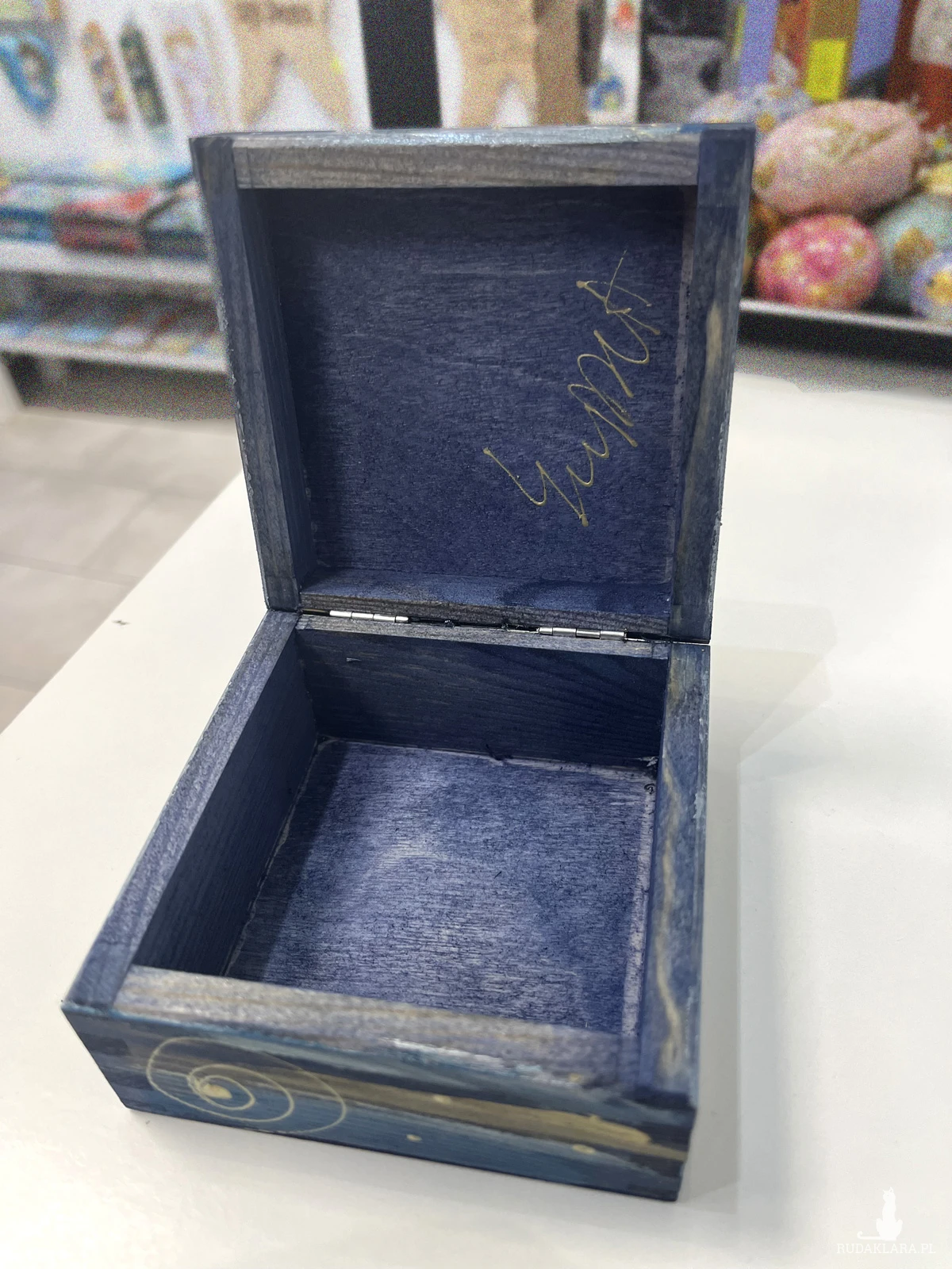Boki szkatułki pomalowane są ręcznie, a całość zabezpieczona jest bezbarwnym lakierem i sygnowana w środku.
