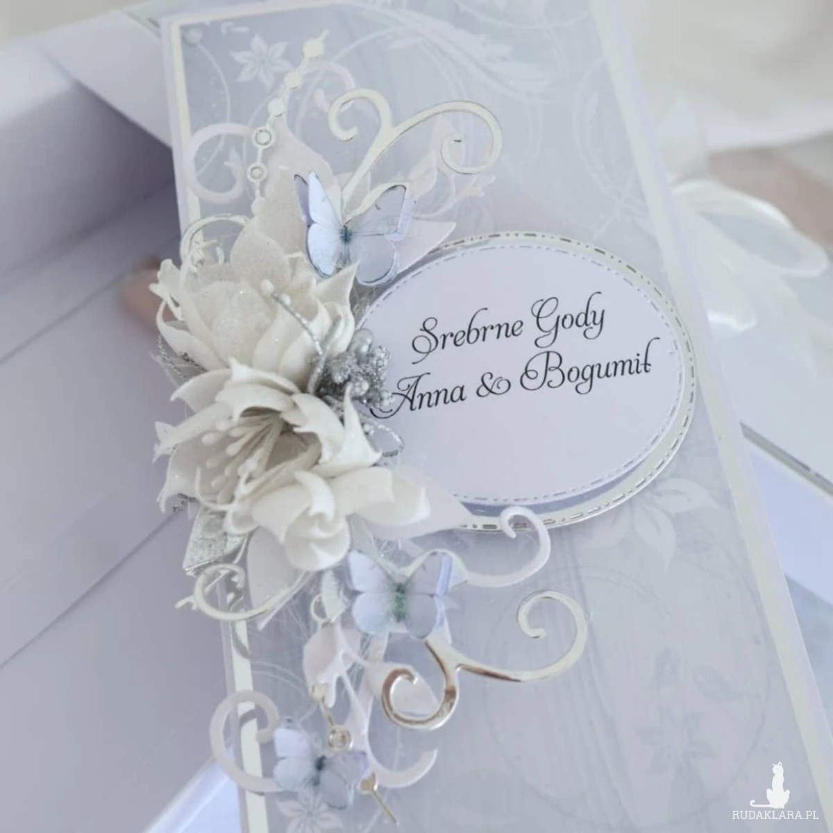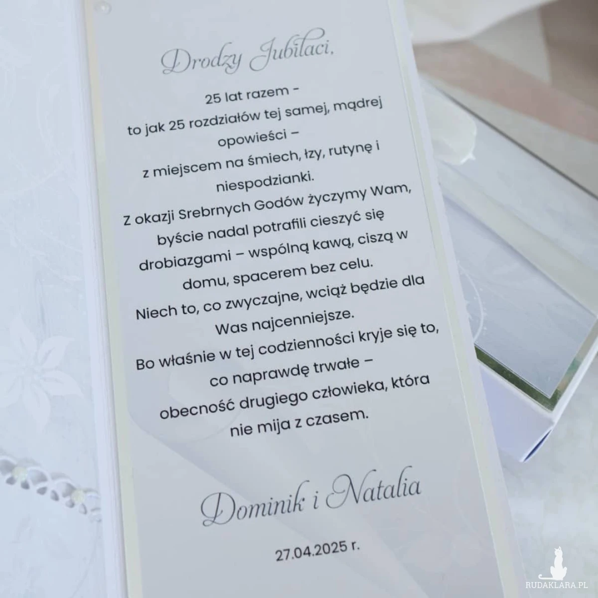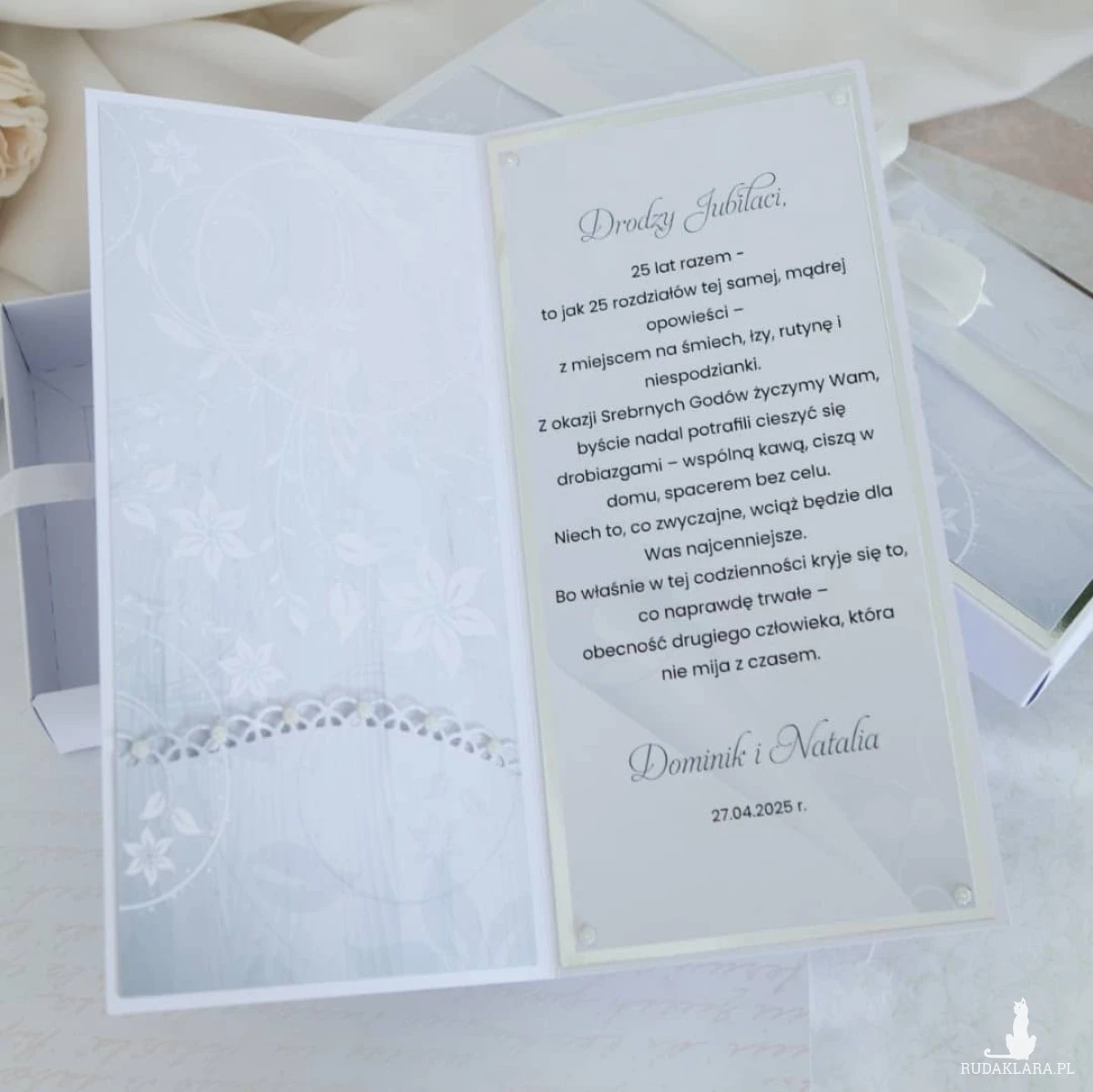 Personalizowana kartka na 25 rocznicę ślubu w eleganckim pudełku to piękny sposób na przekazanie życzeń i wręczenie wyjątkowego prezentu Jubilatom.