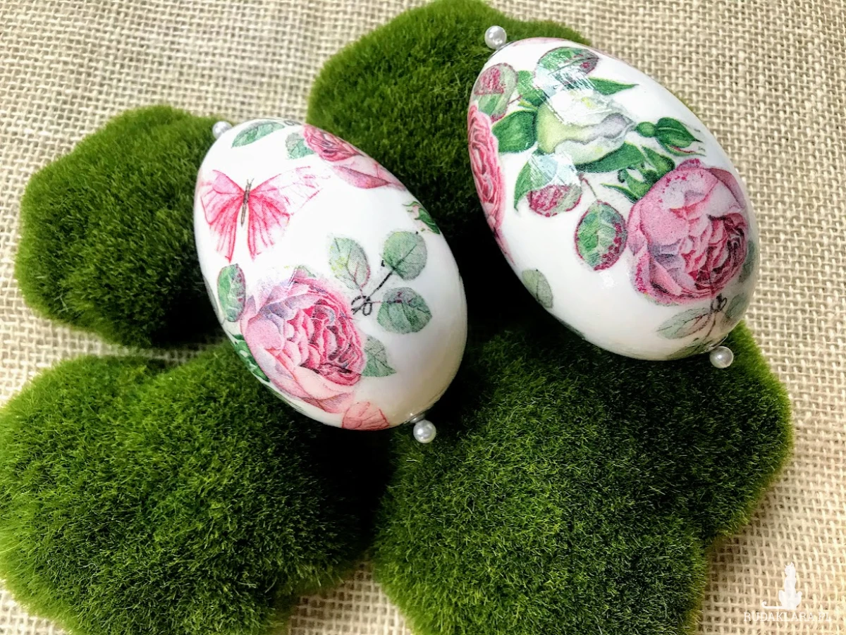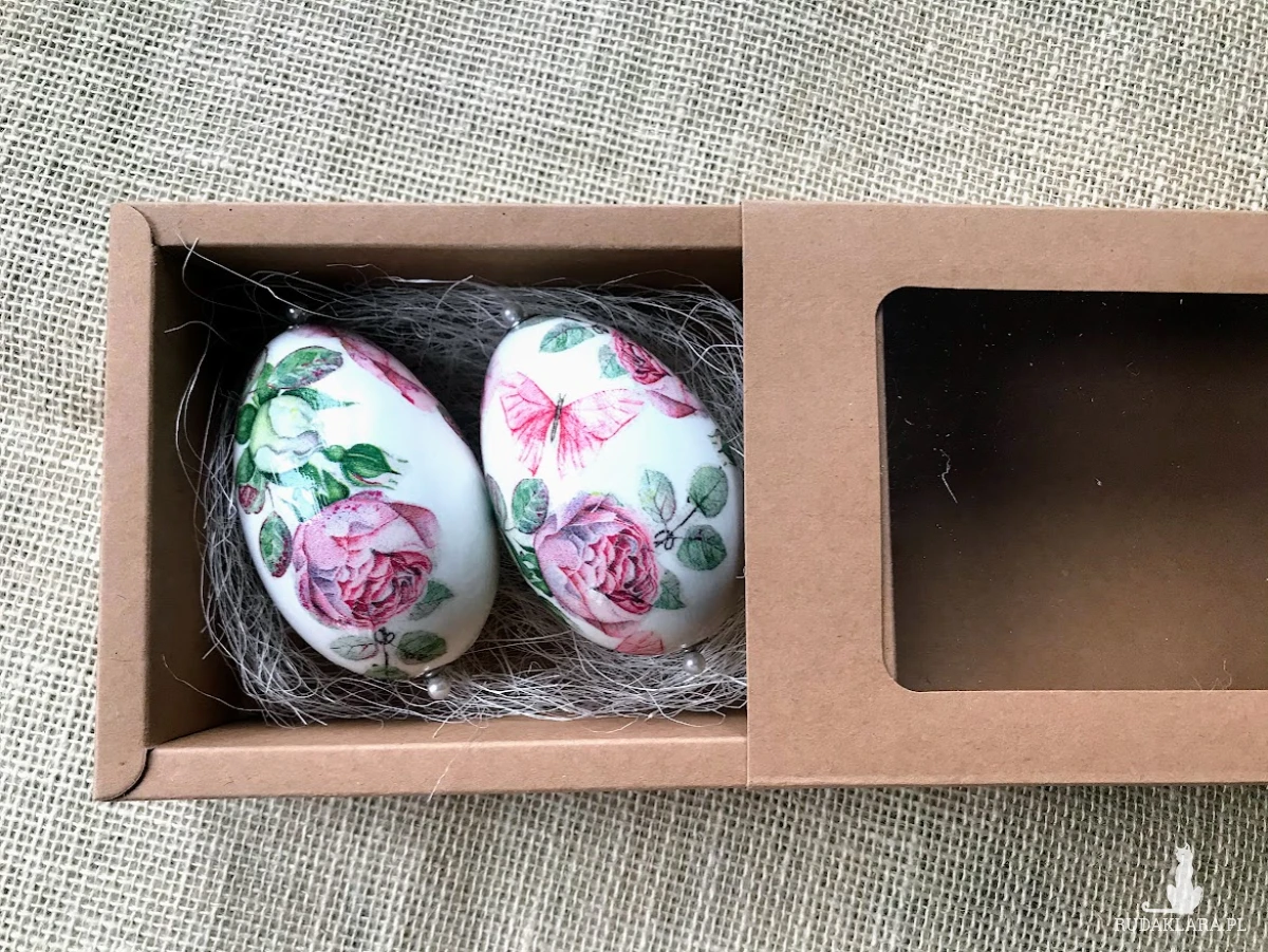 Niezwykle oryginalna dekoracja wielkanocna w formie pisanek gęsich z motywem  kwiatów.. Komplet stanowią 2szt. gęsich pisanek utrzymane w jednej tonacji i stylu. Będą doskonale prezentować się na wielkanocnym stole, w wazonie wśród  gałązek wierzby czy też w wielkanocnym koszyku.Pisanki zostały zapakowane w piękne pudełko z okienkiem na sizalu .Wymiary pudełka 17x13x5,5.Pudełko przewiązane naturalnym sizalem. Ich kolorystyka wywoła uśmiech na twarzy domowników i gości.
