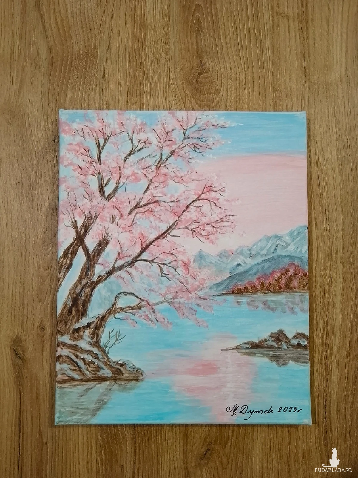 - Tematyka: Kwitnące drzewo nad taflą wody, lawendowe pole