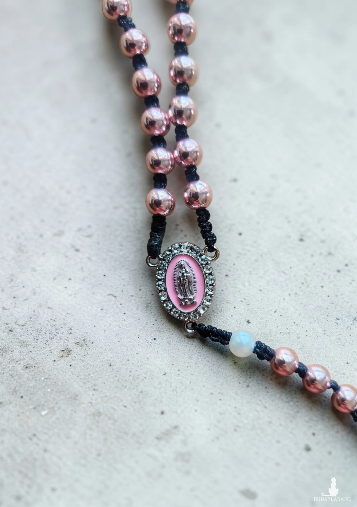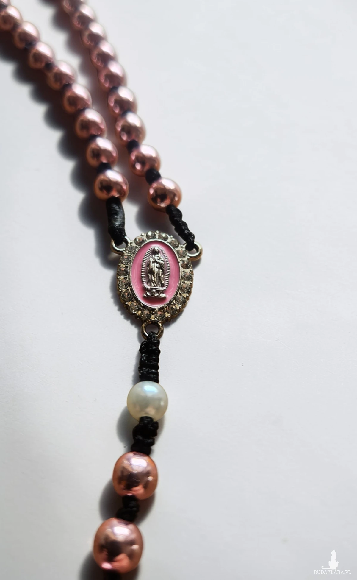 Na sprzedaż piękny różaniec wykonany z metalicznych koralików w odcieniu różowego, przeplatanych jasnymi perełkami. Całość osadzona na solidnym, czarnym sznurku, co zapewnia trwałość i wygodę użytkowania. Zwieńczony ozdobnym krzyżykiem oraz subtelnym medalikiem.