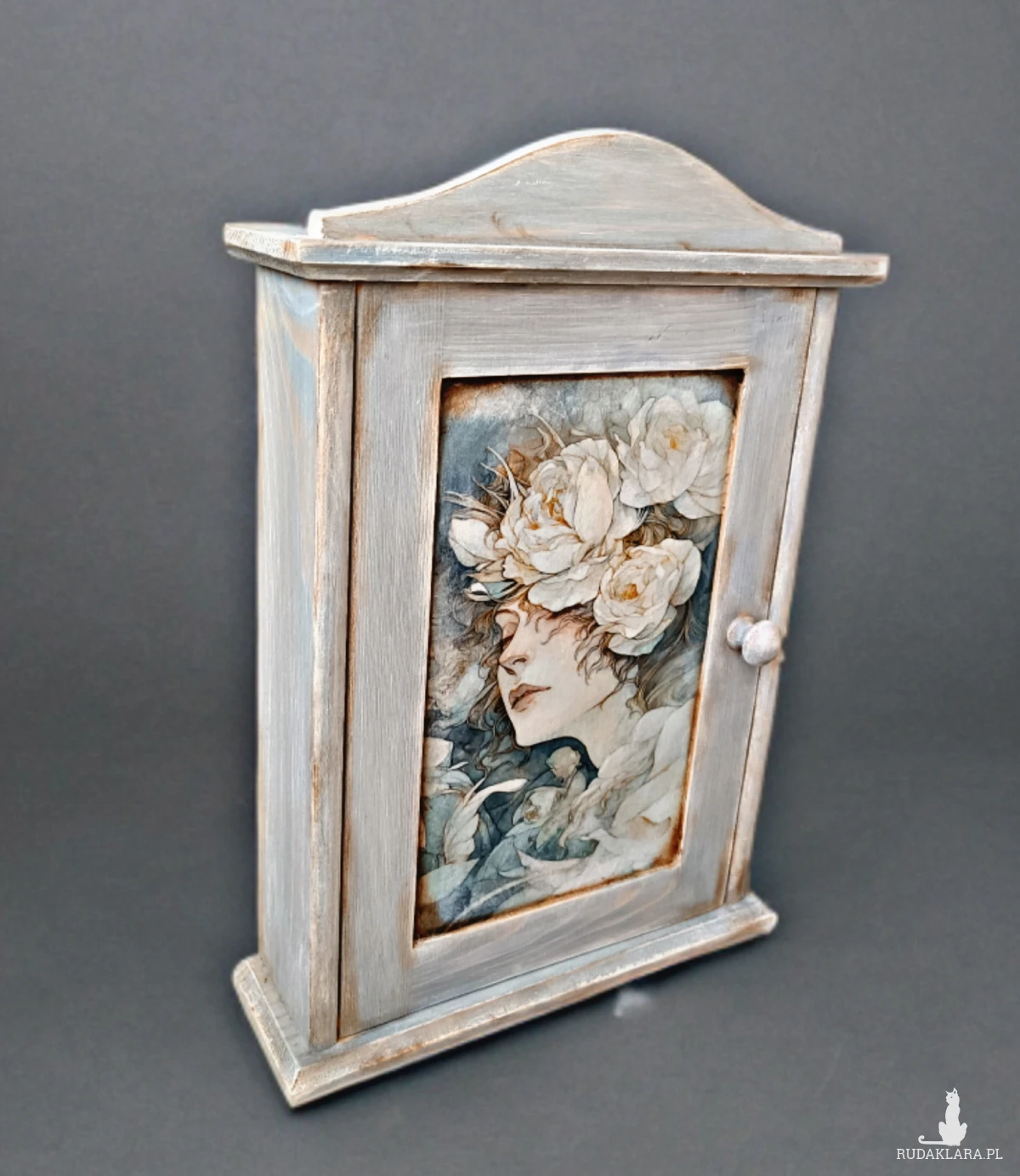 Drewniana skrzyneczka na klucze. Zdobiona za pomocą techniki decoupage.