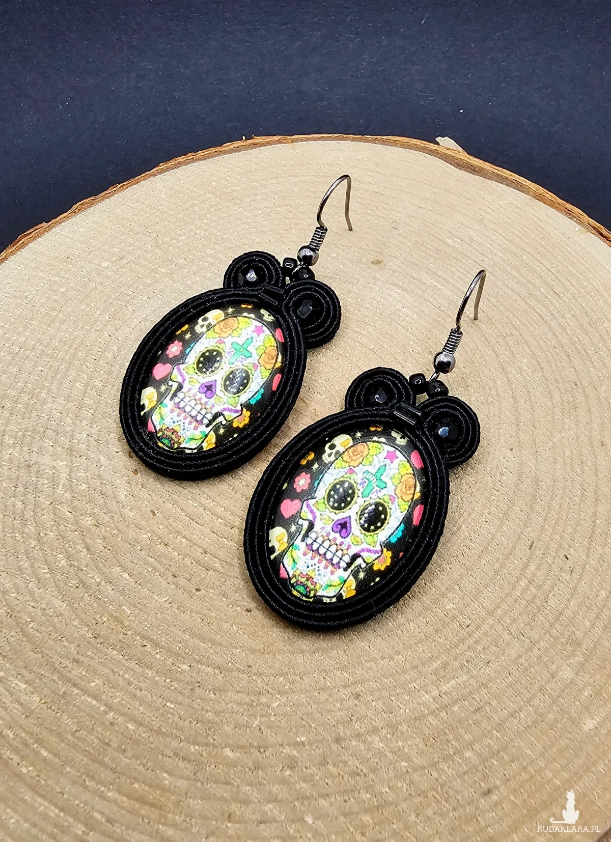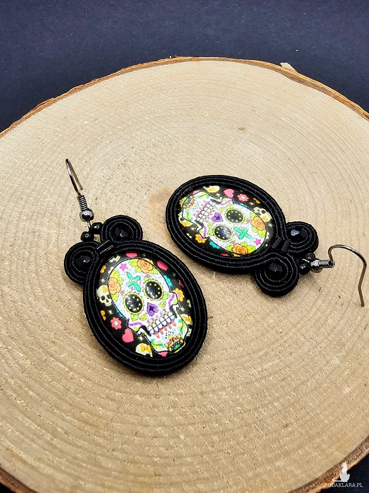 Szklane owalne kaboszony z grafiką czaszki otoczone sznurkami sutasz oraz szklanymi czeskimi koralikami. Kolczyki zawieszsone na metalowych otwartych biglach w kolorze ciemnego srebra.