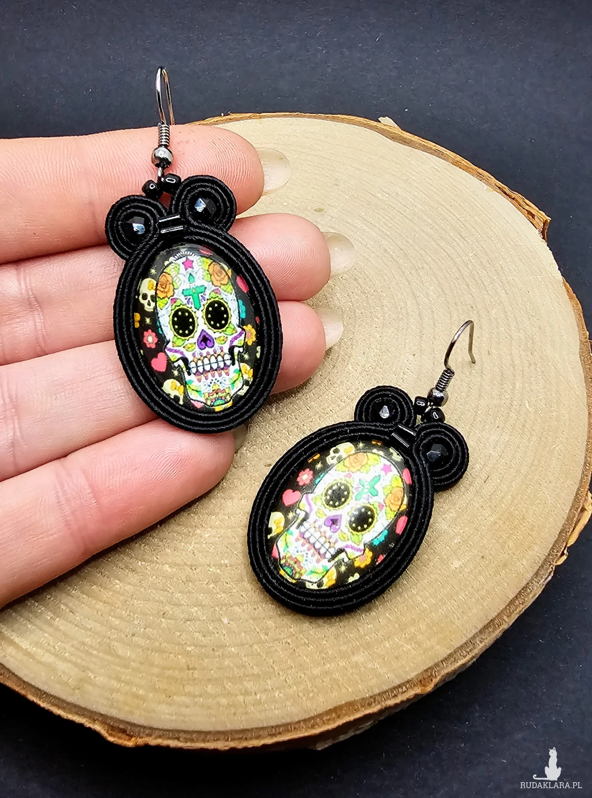 Czarne kolczyki sutasz z kolorowymi czaszkami