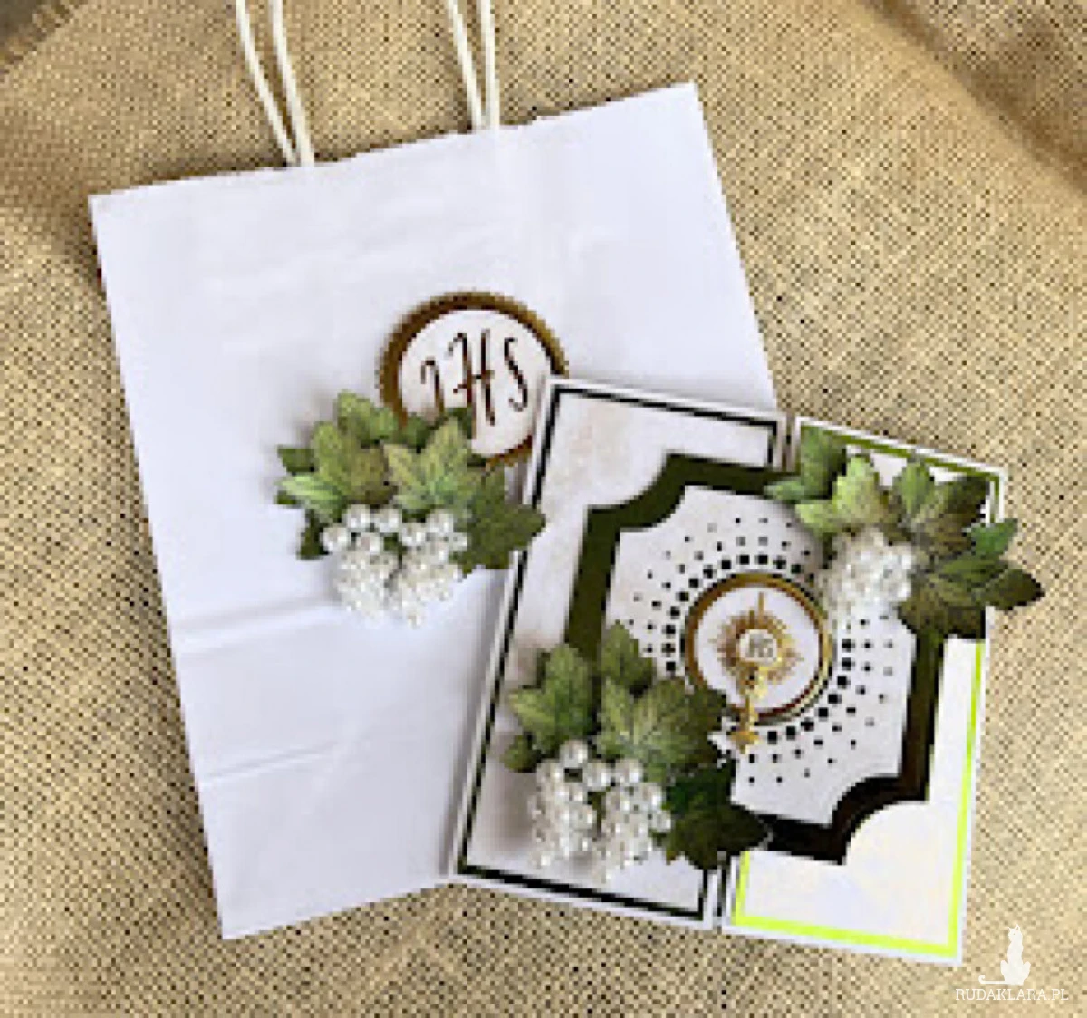 Komplet prezentowy, komunijny zawiera: Piękną i wyjątkową kartkę komunijną w kolorze biało-zielonej; rozmiar kartki 14,0x14,0; pudełko o wymiarach 15,0 x 15,0 z bezbarwnym wieczkiem, wewnątrz kartki gotowe życzenia do własnoręcznego podpisu a na dnie pudelka kieszonka na małe co nieco, Do kompletu biała torebka ozdobiona w tej samej stylistyce co kartka. Wymiar torebki 22,0x18,0. W tej postaci produkt gotowy do natychmiastowej wysyłki
