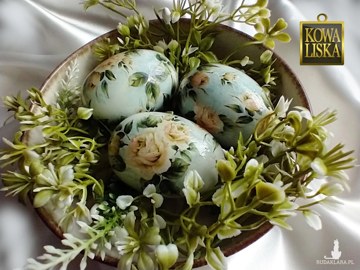 Trwałe pisanki wielkości jaj kurzych, zdobione metodą decoupage i zabezpieczone szklistą warstwą żywicy.