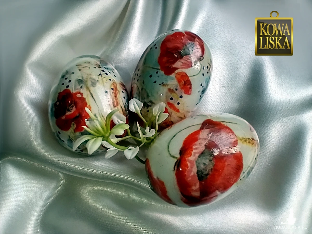 Trwałe pisanki wielkości jaj kurzych, zdobione metodą decoupage i zabezpieczone szklistą warstwą żywicy.