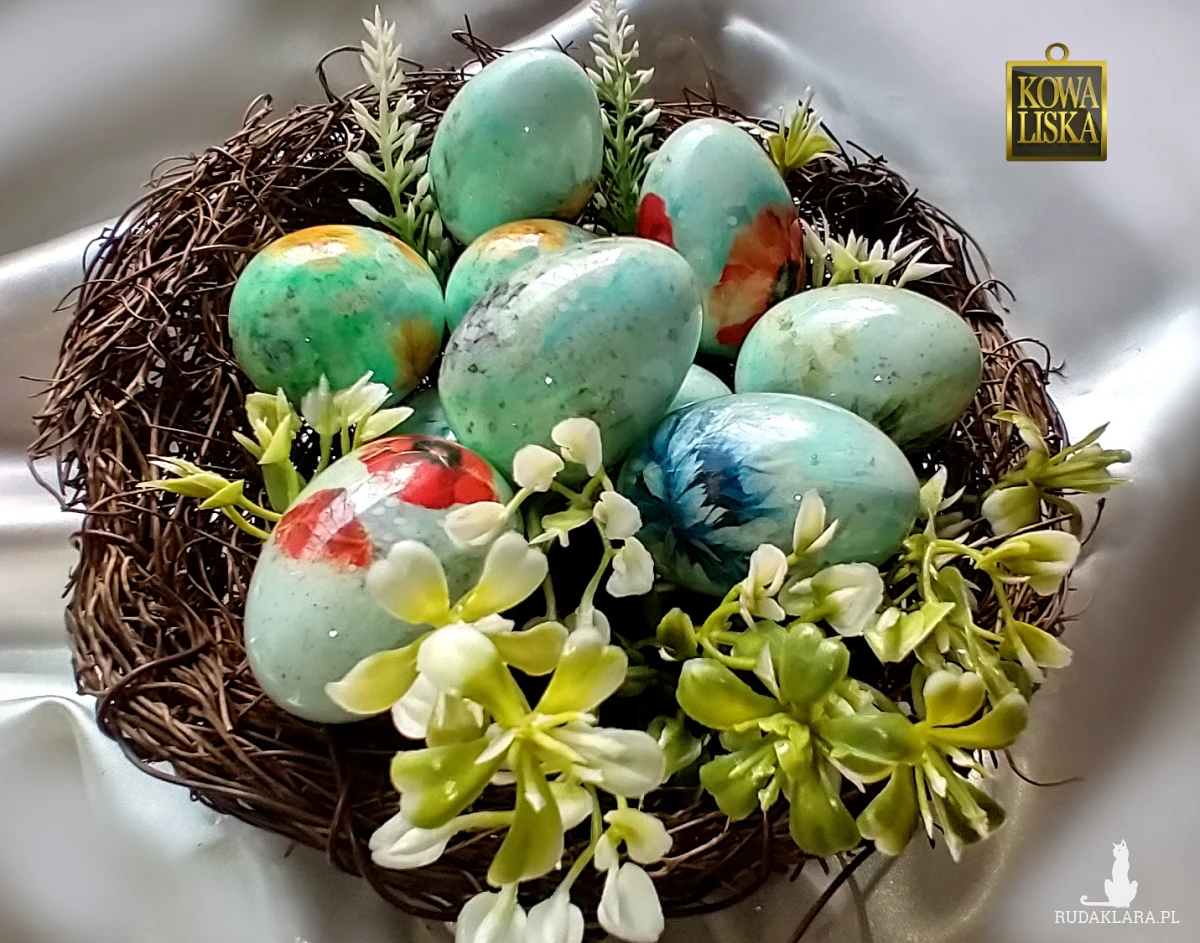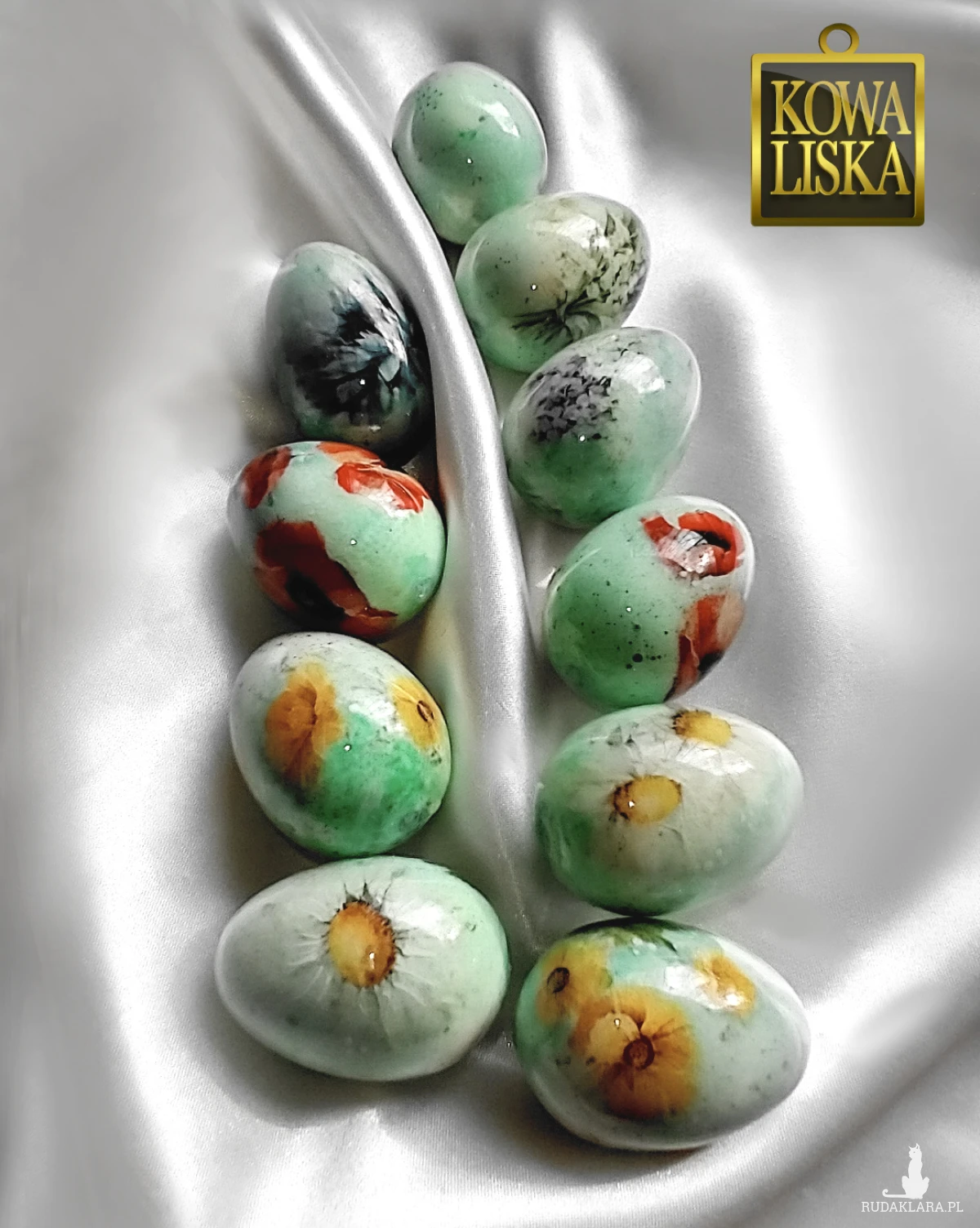Trwałe pisanki wielkości jaj przepiórczych, zdobione metodą decoupage i zabezpieczone szklistą warstwą żywicy.