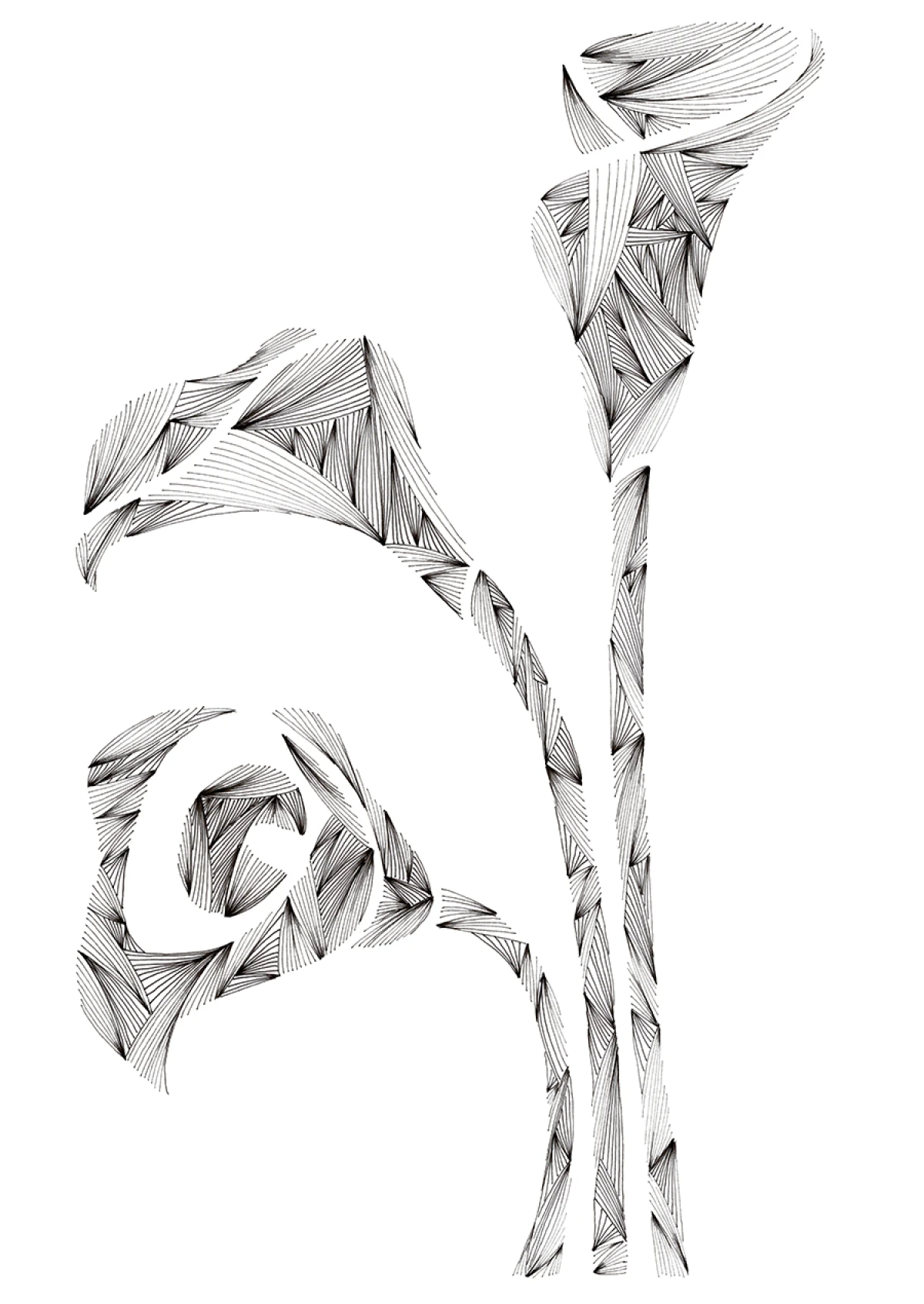Minimalistyczny, linearny rysunek przedstawiający bukiet kwiatów kalii.