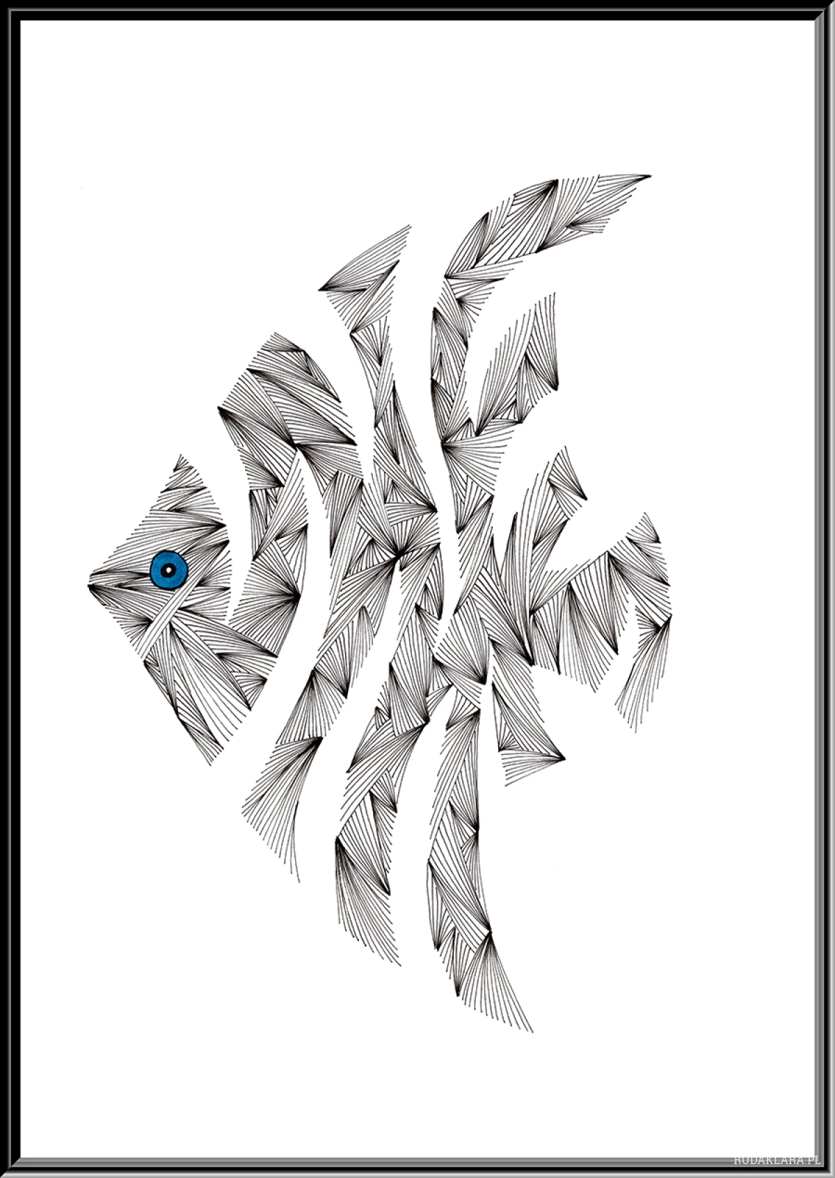 Geometryczna, abstrakcyjna kompozycja przedstawiająca rybę, zbudowana z dynamicznych, wielokierunkowych pasm gęstych, równoległych czarnych kresek na białym tle. Kontrastowym akcentem jest jedno jasnoniebieskie oko.