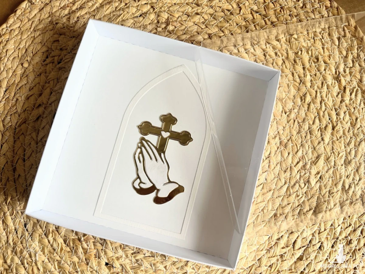 Kartka ręcznie robiona na Komunię Świętą , w pastelowych kolorach z dodatkiem lustrzanego złota. Wewnątrz kartki gotowe życzenia do własnoręcznego podpisu oraz miejsce z kieszonką na małe co nieco. Wielkość kartki 14,5x14,5cm .pudełka15,5x15,5cm Do kartki dołączono torebkę w tej samej stylizacji co kartka, wymiary 22,5x18x8 cm.W tej postaci kartka do natychmiastowej wysyłki,
