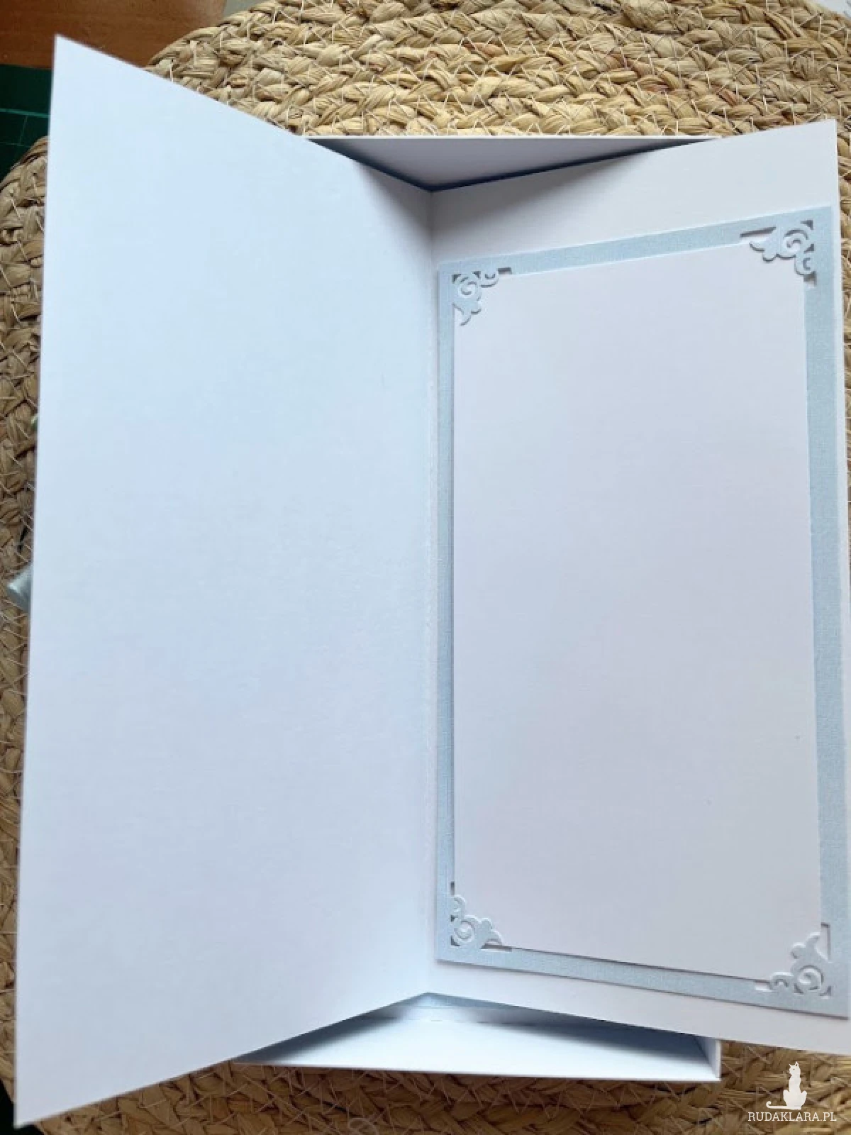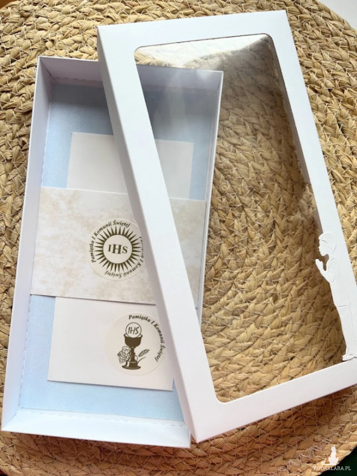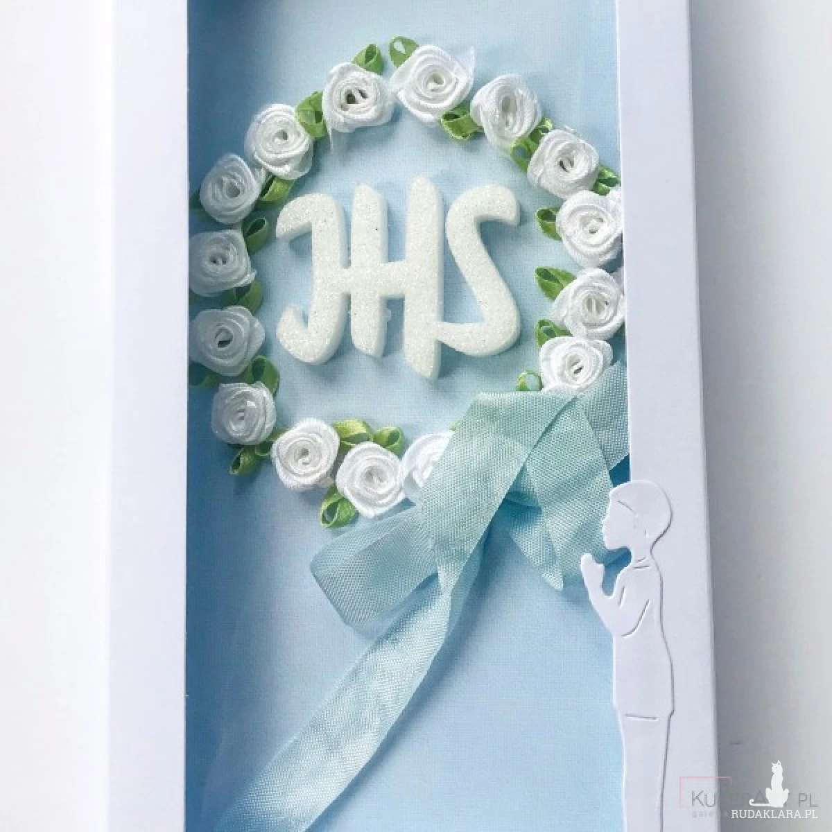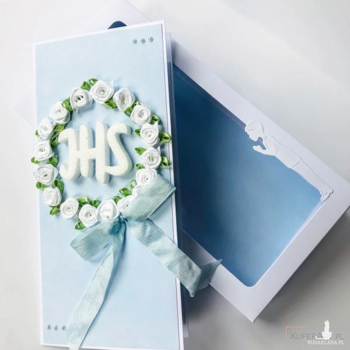 Elegancka, bogato zdobiona kartka w pudełku z okazji Pierwszej Komunii Świętej. Utrzymana w całości w delikatnym błękicie z elementem bieli .ozdobiona kwiatami. Kartka jest w całości wykonana ręcznie z najlepszej jakości materiałów do scrapbookingu. Wielkość pudełka 11,5 x 22,5 x 2,5. Wielkość kartki 21 x 10 z tagiem na wypisanie własnych życzeń . Na dnie pudełka umieszczono kieszonę z kopertą n małe co nieco.Komplet w tej postaci dostępny od ręki .polecam