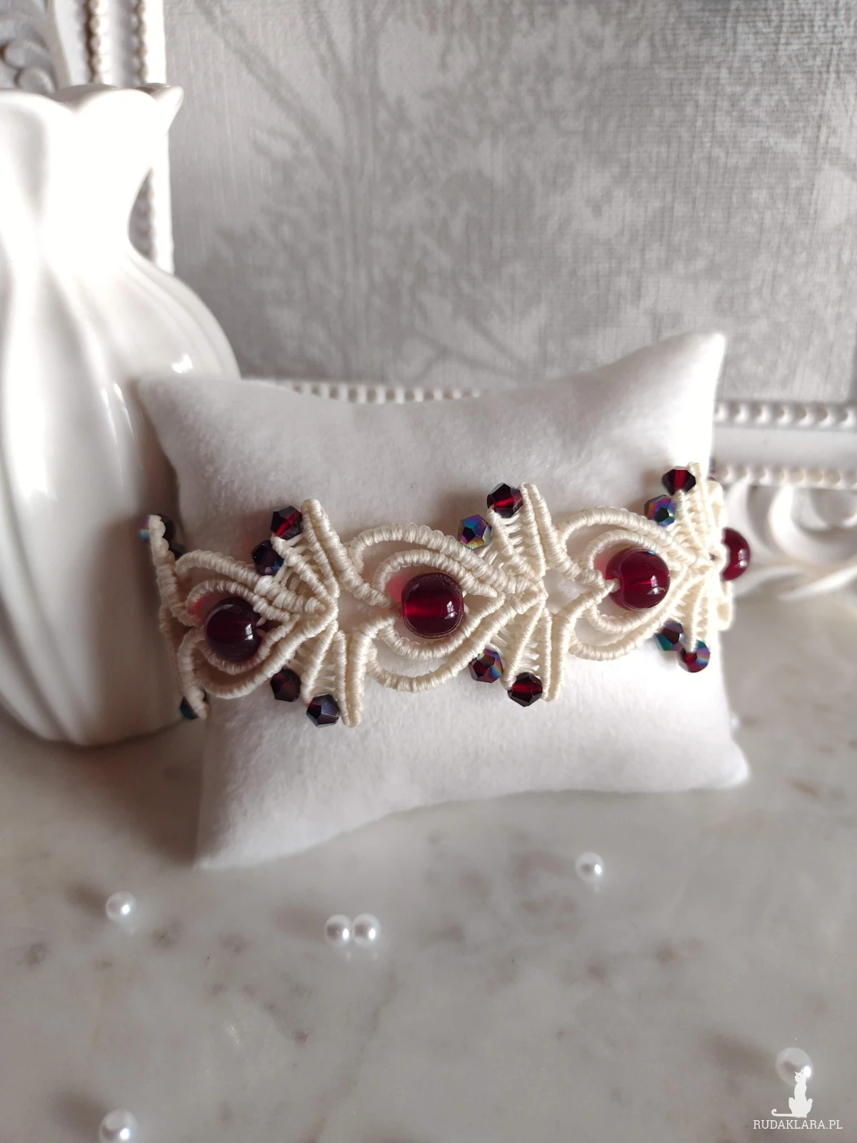 Ręcznie wykonana bransoletka w odcieniu kremowej bieli łączy subtelność mikromakramy z głębokim kolorem granatowych kamieni. Ich intensywna barwa pięknie kontrastuje z jasną bazą, tworząc elegancką i przyciągającą spojrzenia kompozycję.
