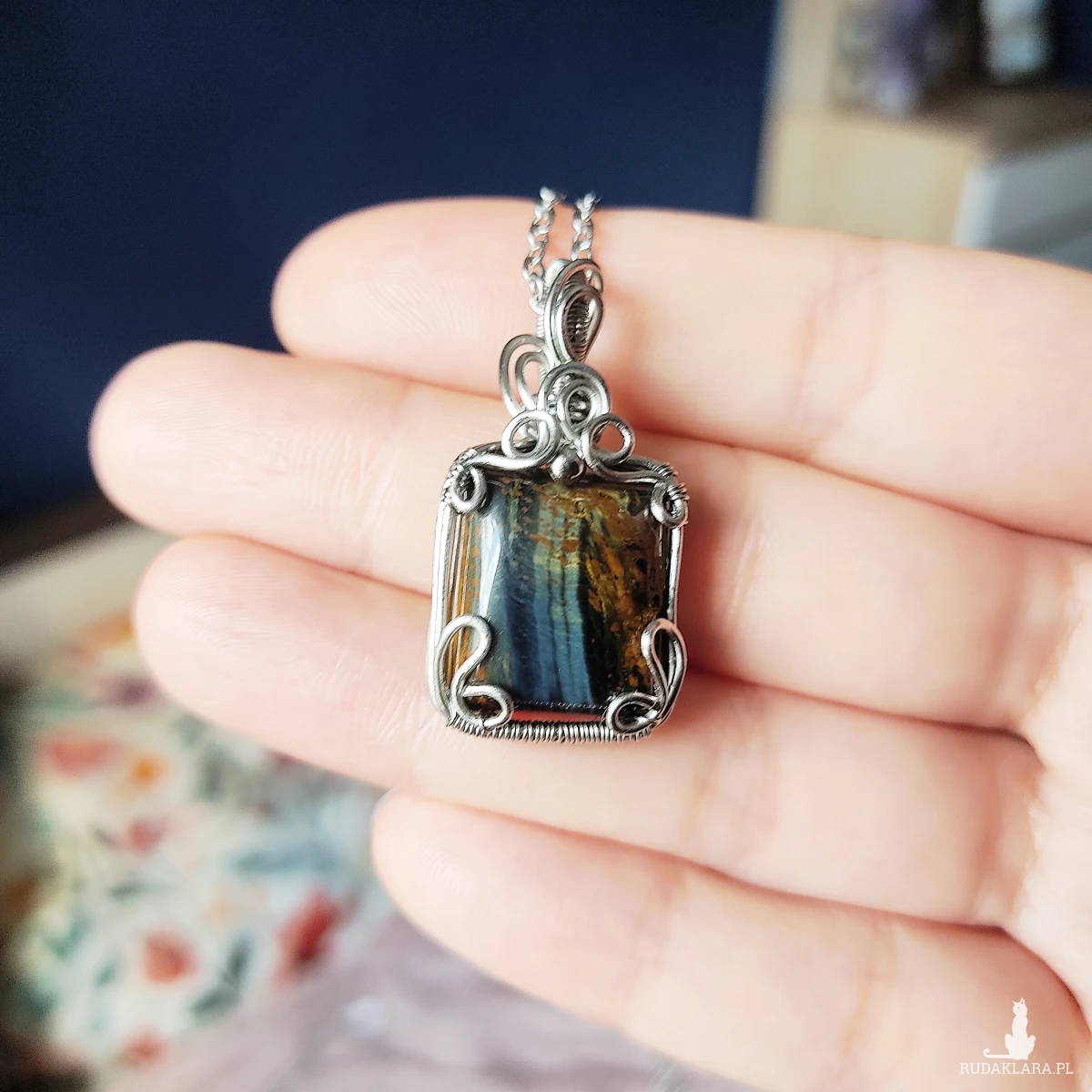 Naszyjnik Pietersyt ręcznie robiony. Wykonany techniką wire wrapping z drutów ze stali chirurgicznej.