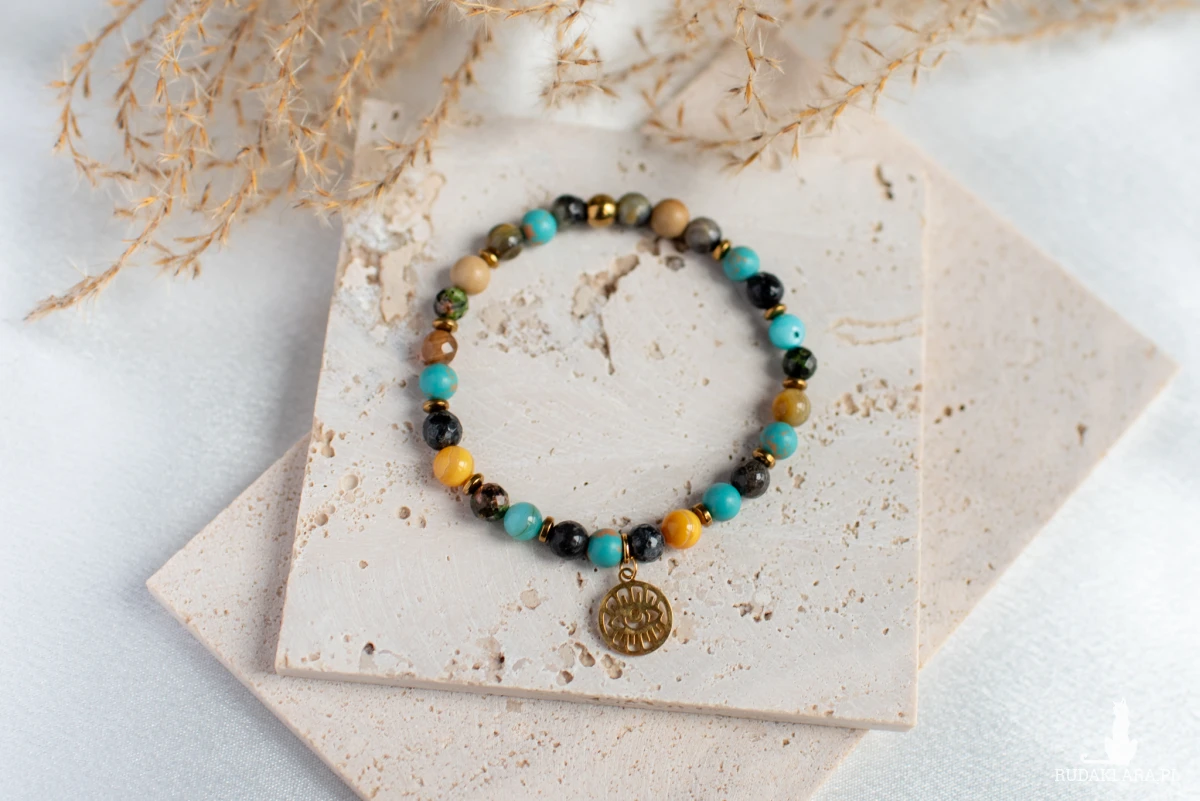 Energetyczny mix kamieni naturalnych. Bransoletka z magnezytu, unakitu, agatu, jaspisu i masy perłowej z zawieszką oko proroka.
