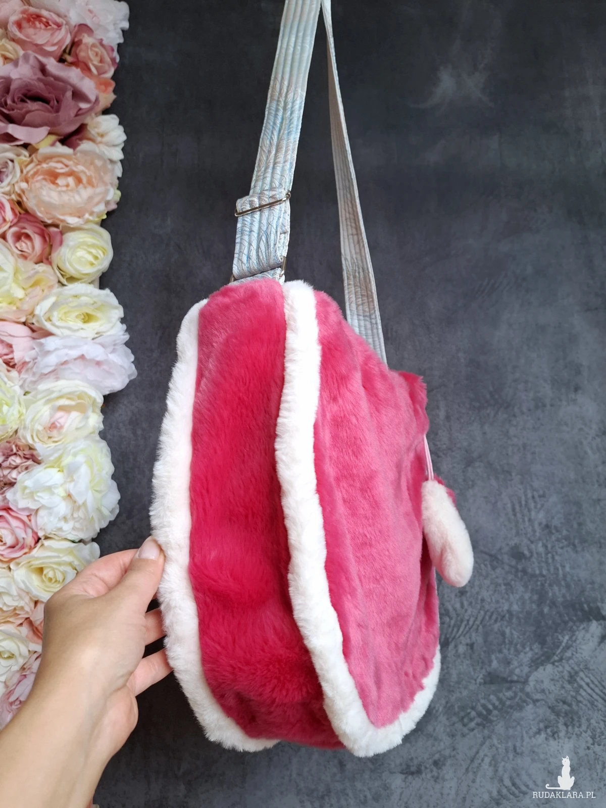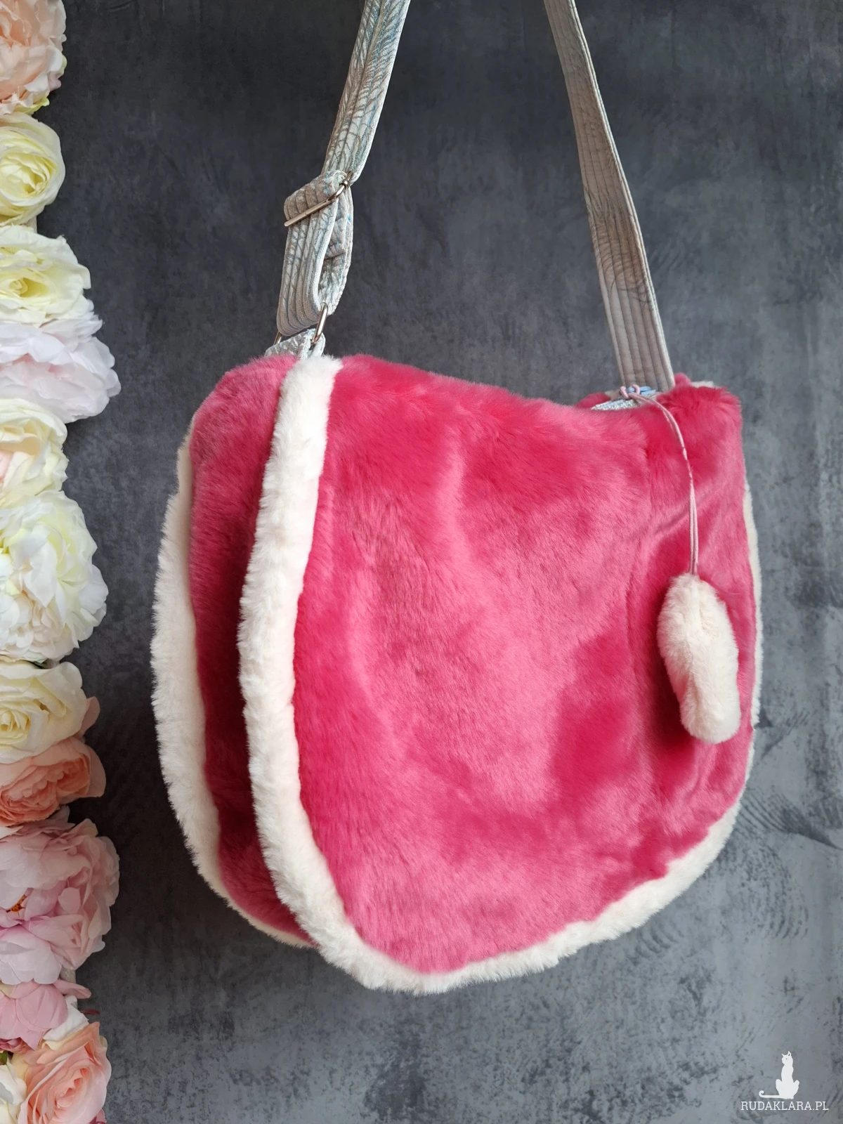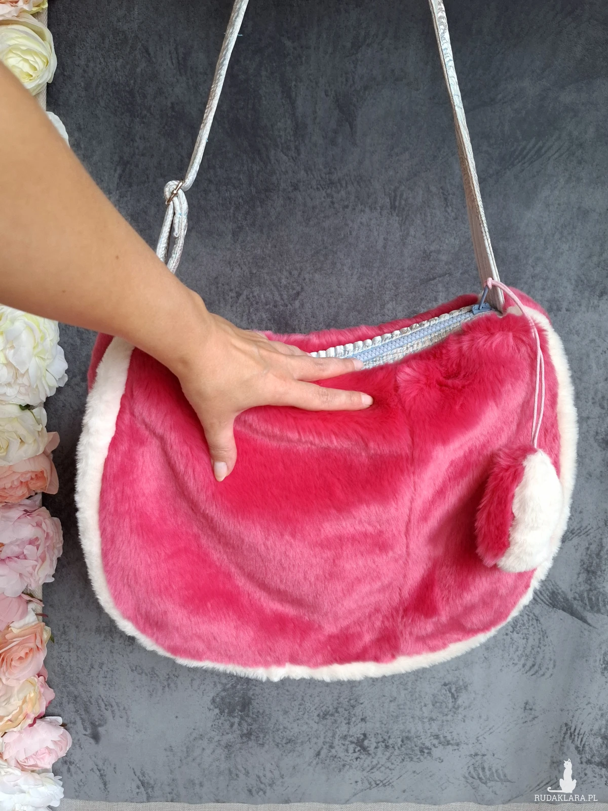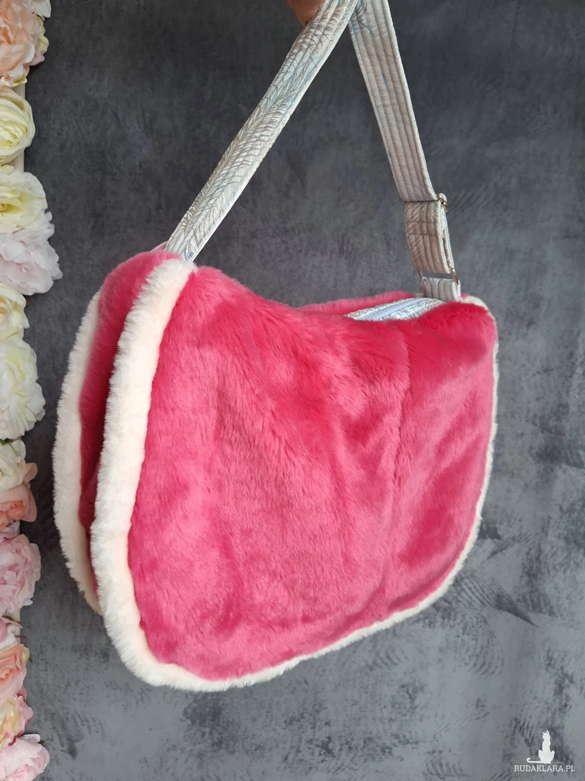 Spora torba na ramię, w intensywnie różowym kolorze, wykonana z pluszowego futerka. Jest niesamowicie miękka i miła w dotyku. Niebieski środek wykonany z pikowanej satyny. W środku kieszonka zamykana na magnes. Tkaniny 100% poliester. Torebka pomieści format A4. Jej wymiary to: 39/ 28/ 8 cm. Długość zamka 29 cm. Regulowany pasek o maksymalnej długości 128 cm