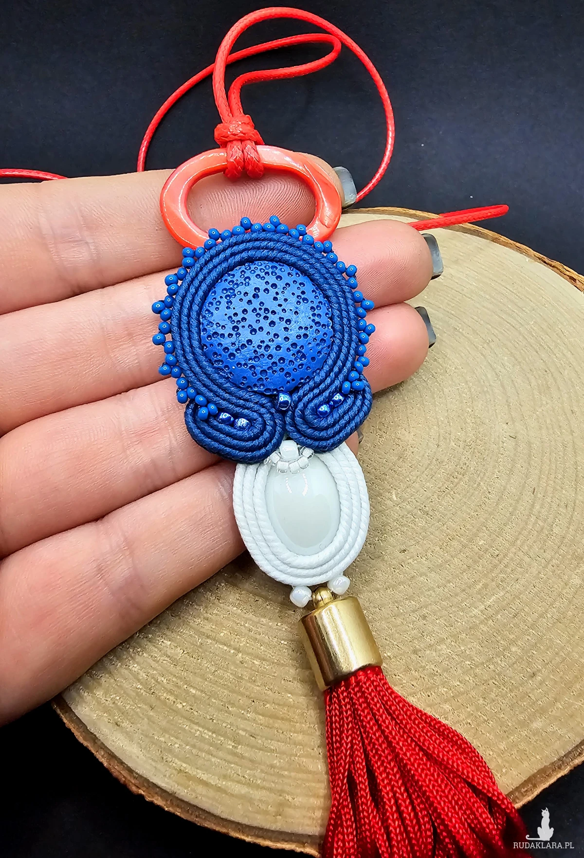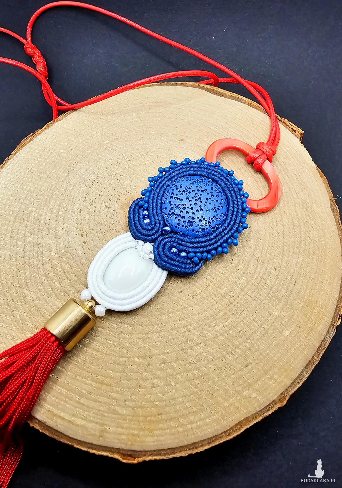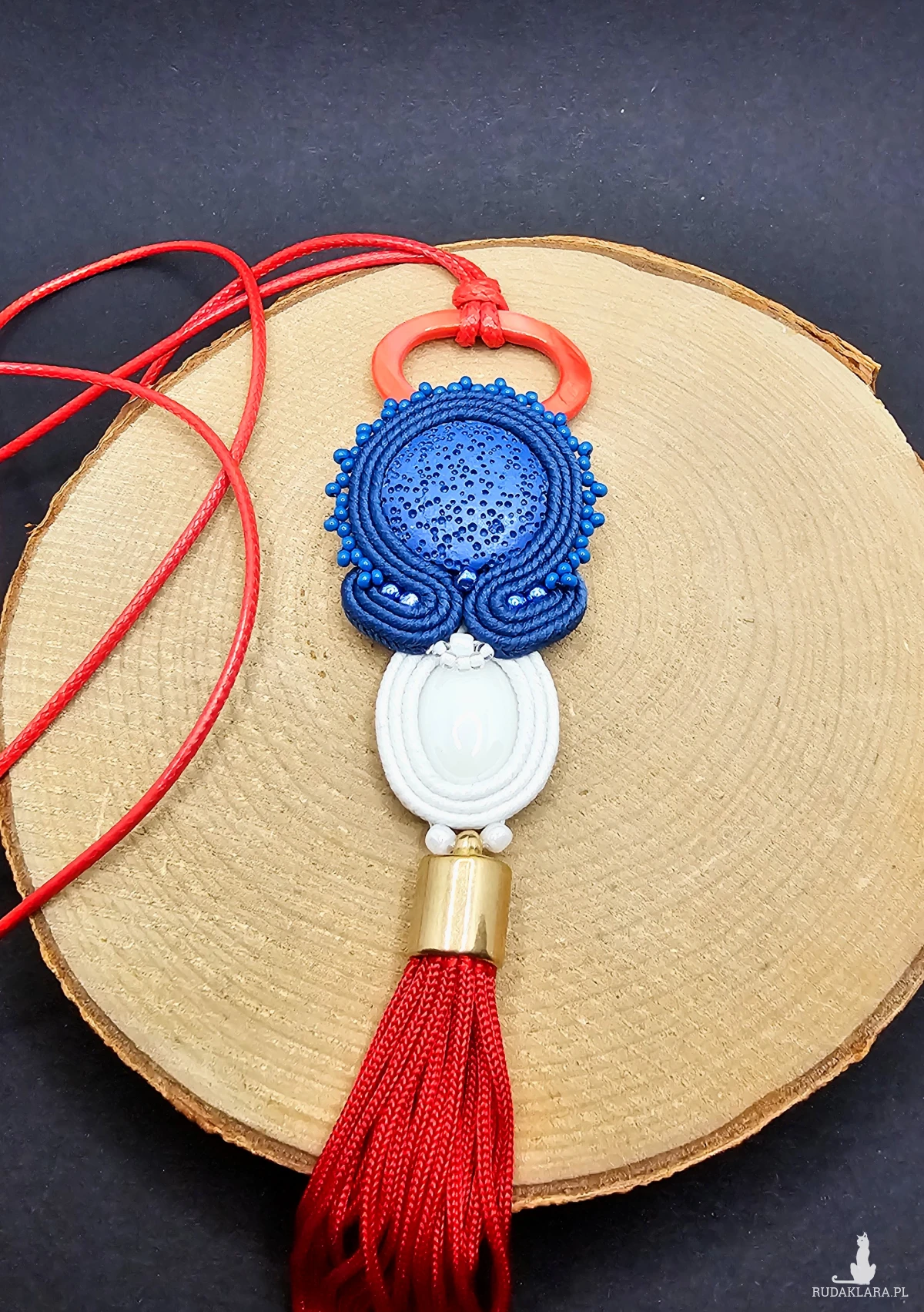 Kaboszony z granatowej lawy i białej ceramiki otoczone polskimi sznurkami sutasz oraz szklanymi czeskimi i japońskimi koralikami o różnych kształtach i wielkościach. Dół wisiora zakończony czerwonym chwostem w złotej oprawie. Górę wisiora zdobi owalna masa perłowa. Wisior zawieszony na czerwonym powlekanym sznurku z możliwością regulacji długości.