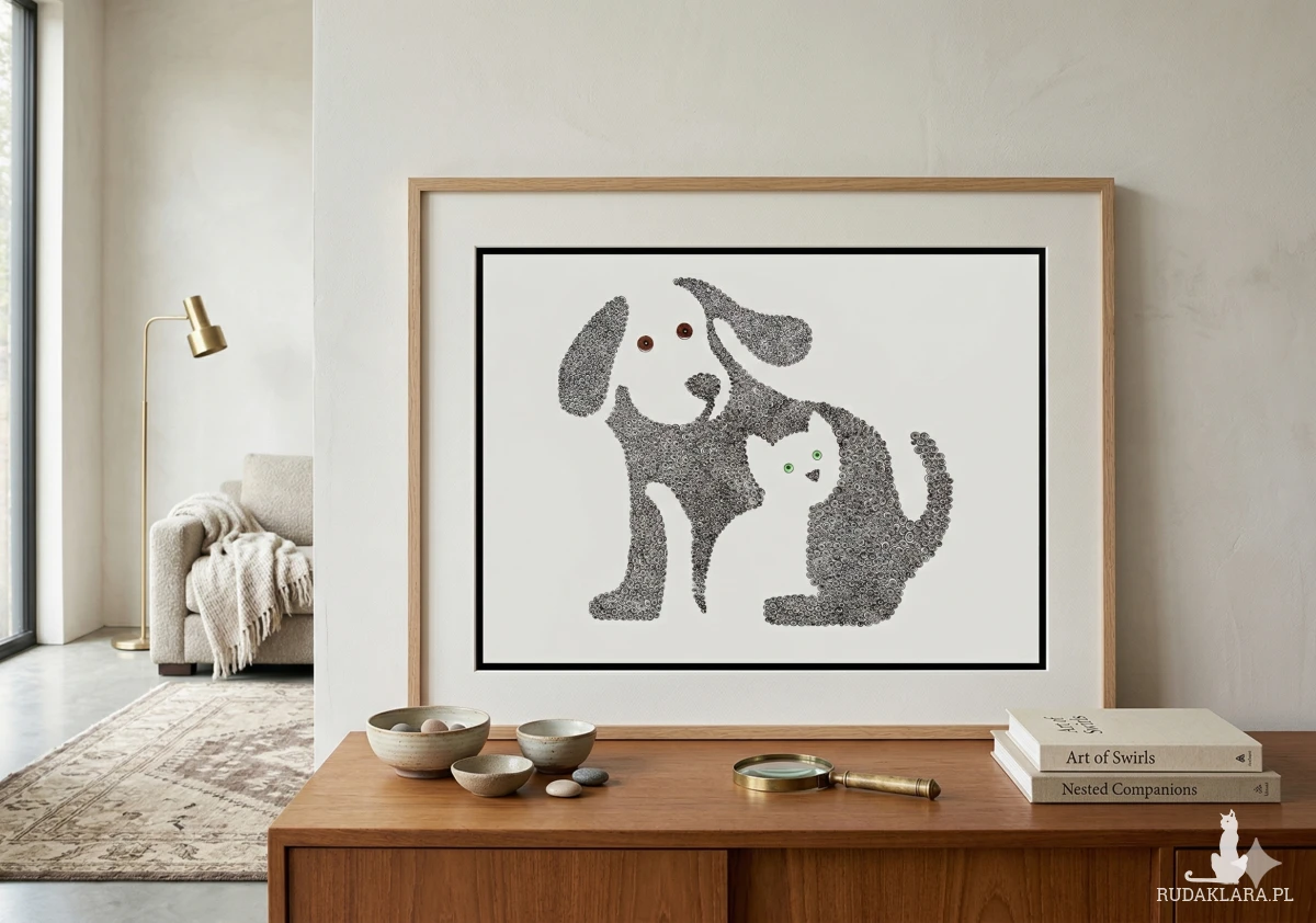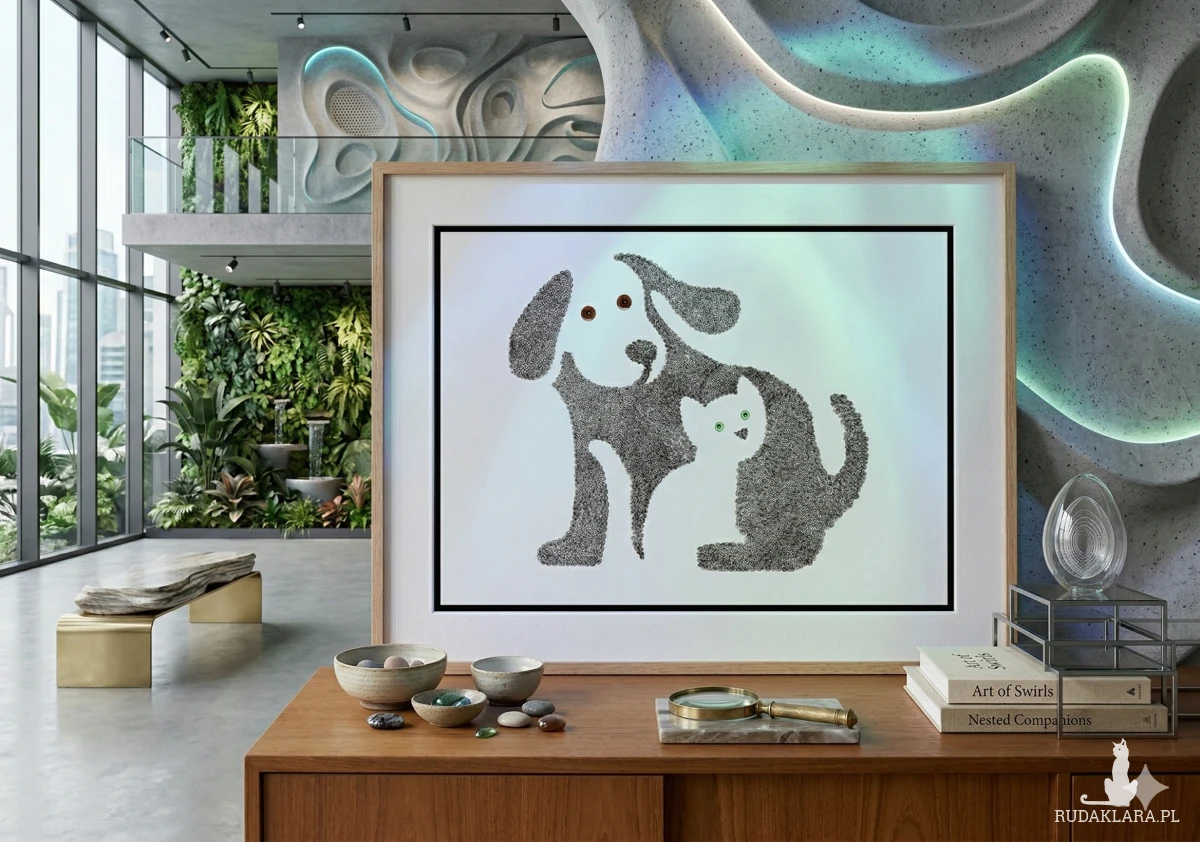 "Pies z Kotem" to coś więcej niż tylko rysunek – to zaproszenie do świata subtelnych form i harmonii. To idealny wybór dla tych, którzy cenią niebanalne rozwiązania i szukają ozdoby, która przyciągnie wzrok i zachwyci swoim subtelnym pięknem.