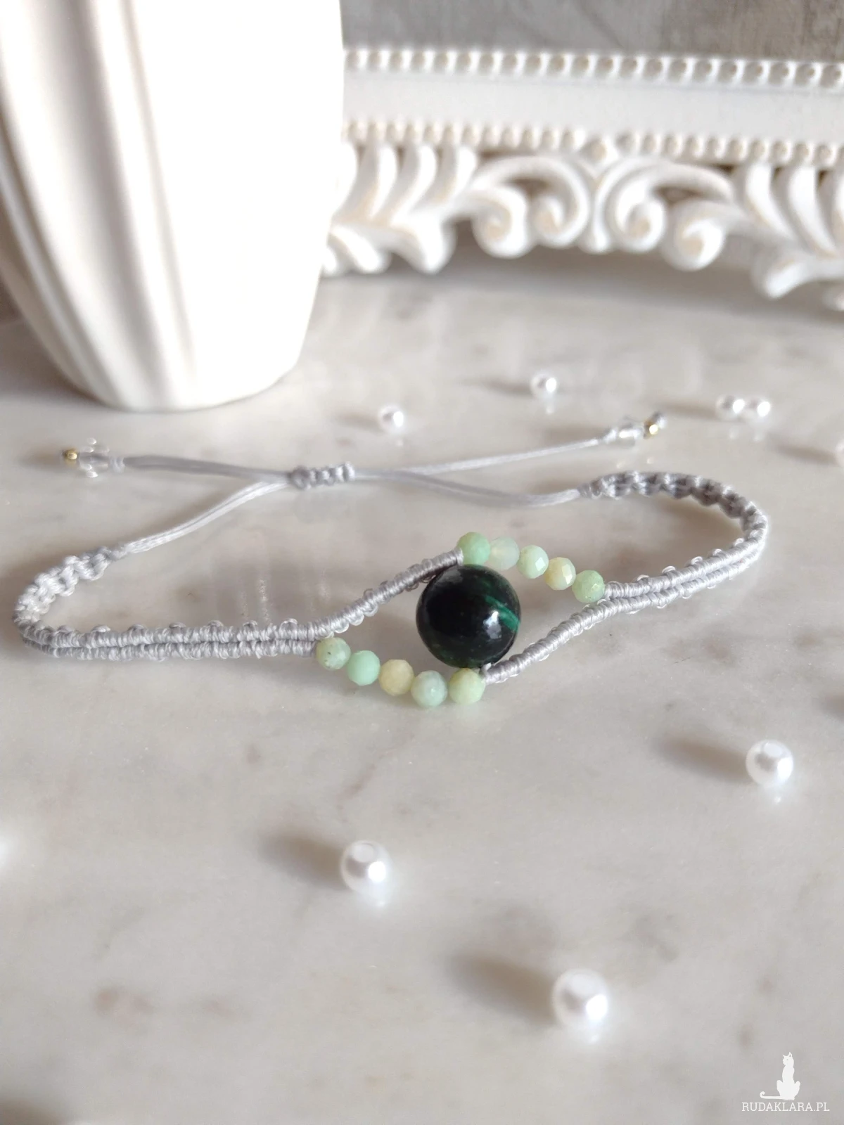 Subtelna, ręcznie wykonana bransoletka w technice mikromakramy, utrzymana w stonowanej szarości, która pięknie podkreśla głębię zieleni naturalnego kamienia. Centralny szmaragd przyciąga wzrok swoją intensywną barwą, a otaczające go jadeity australijskie dodają lekkości i świeżości całej kompozycji.