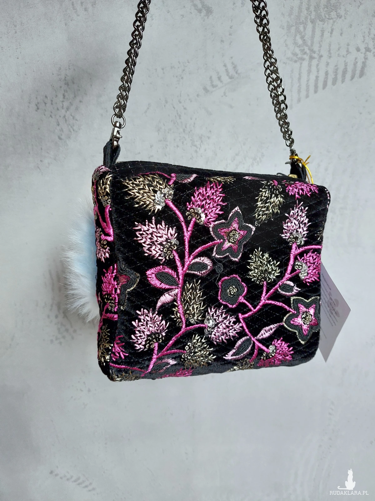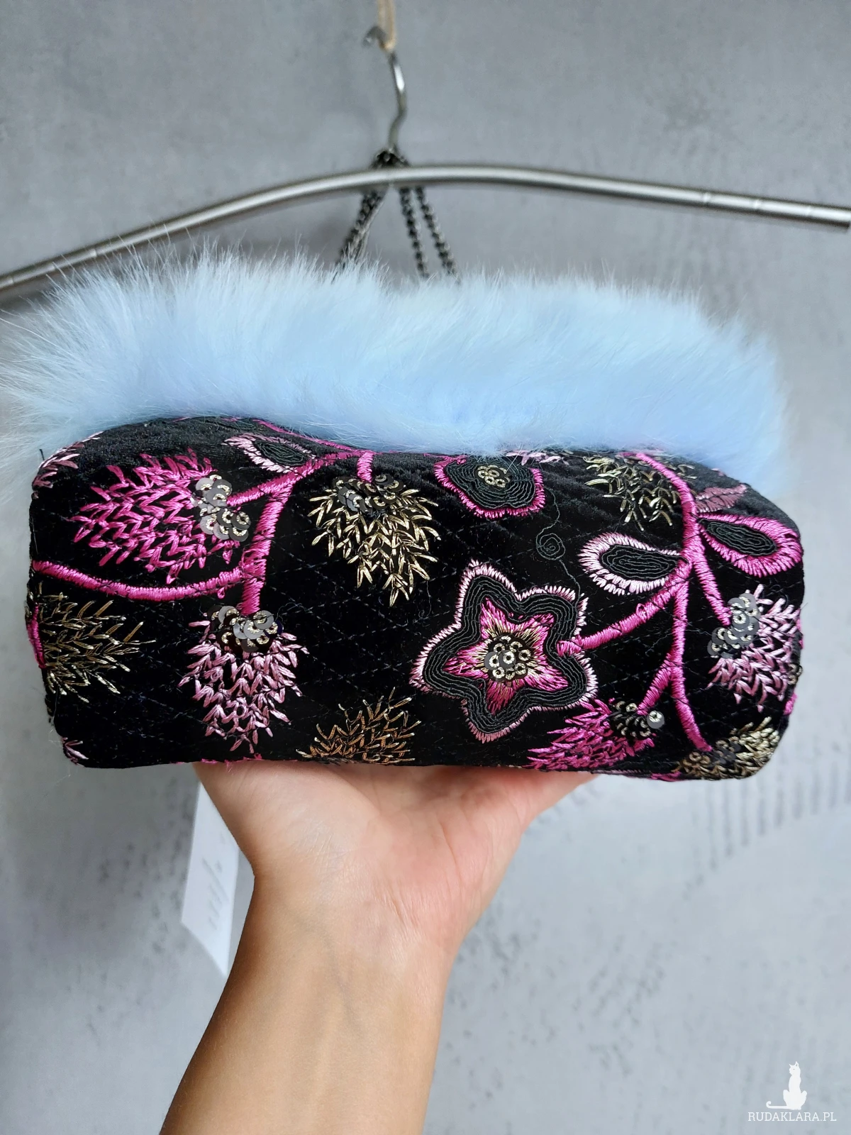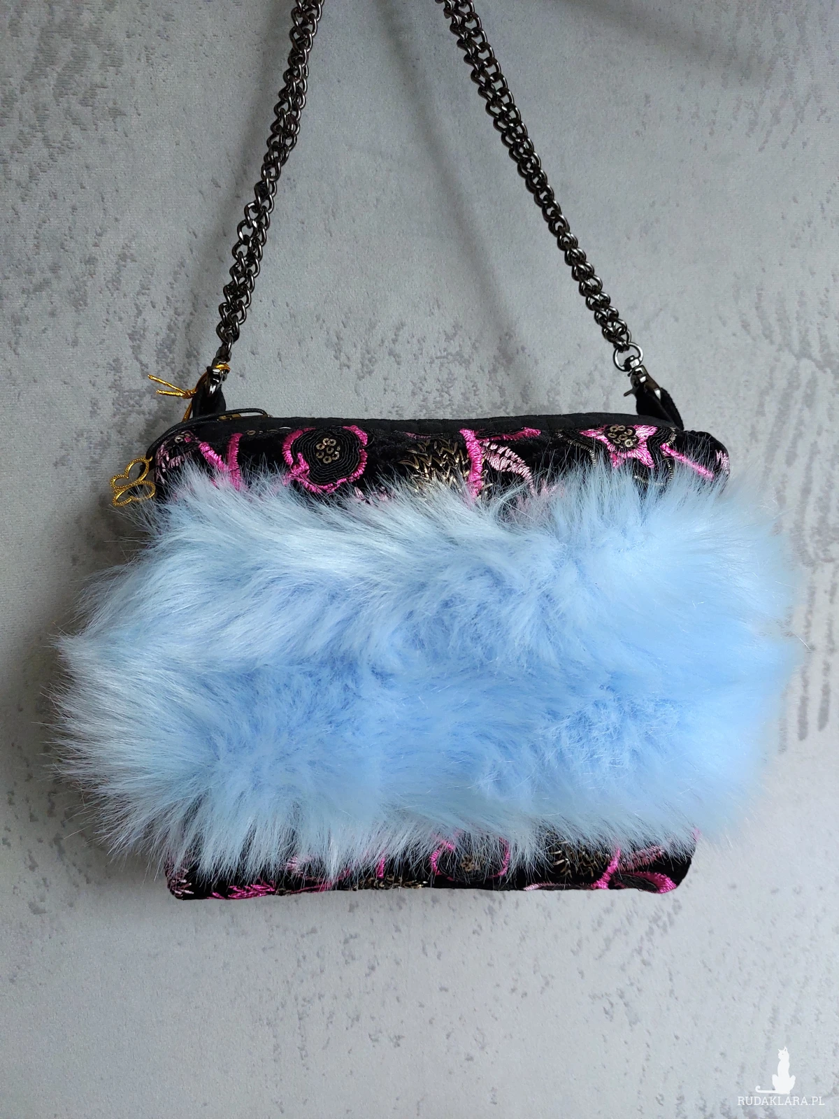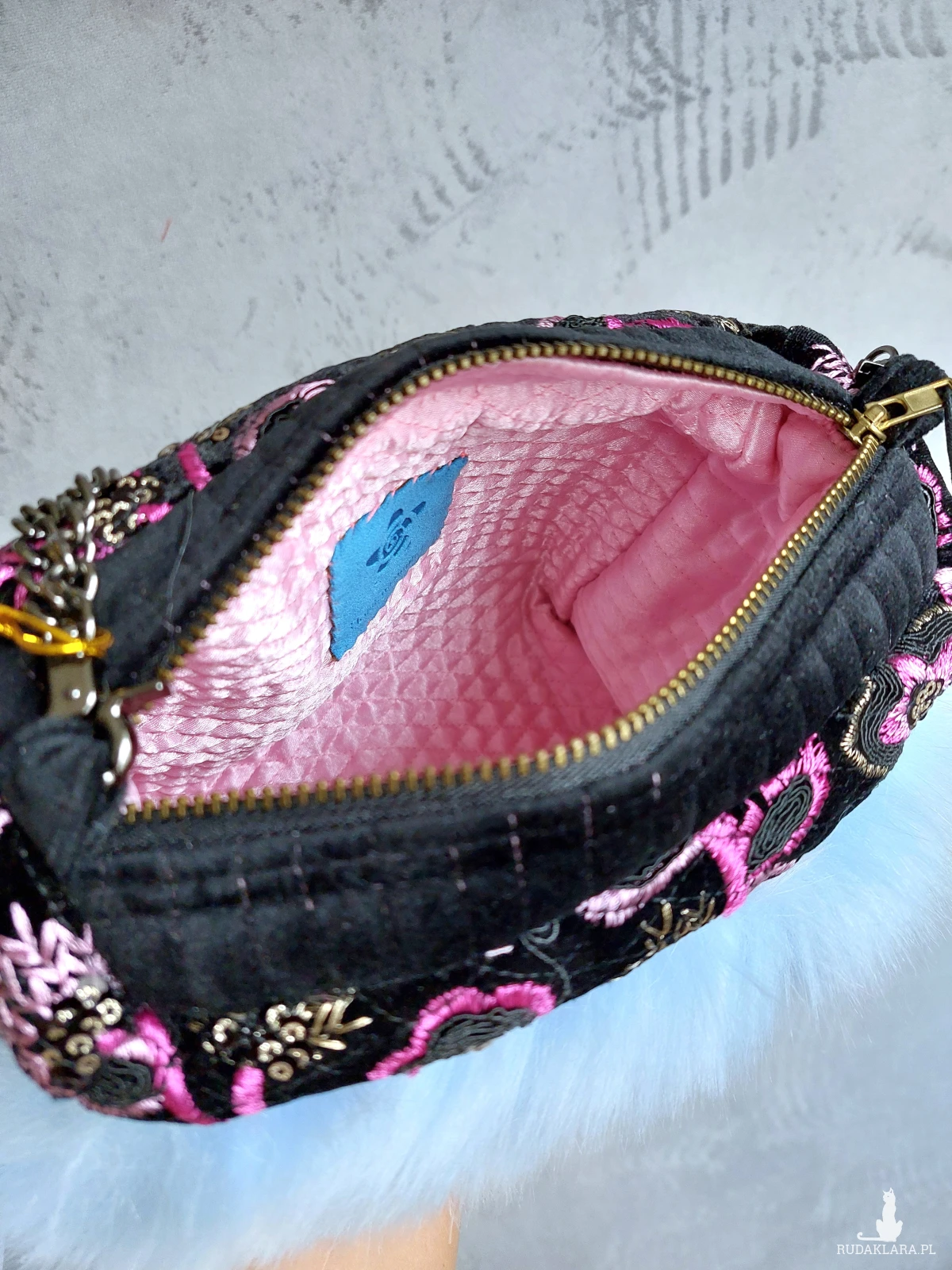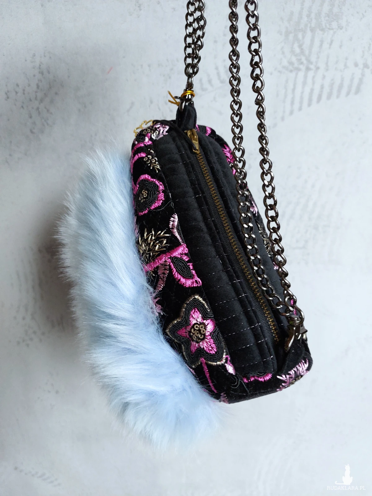 Ozdobna wyjazdowa kosmetyczka w kształcie kuferka z łańcuszkowym uchwytem. Kosmetyczka wykonana jest z czarnego, haftowanego aksamitu, oraz przemiłego w dotyku futerka w odcieniu baby blue. Wnętrze z różowej satyny. Kosmetyczka powstała w jednym, niepowtarzalnym egzemplarzu. Wymiary: 18/ 17/ 8 cm, całkowita długość łańcuszka 49 cm.