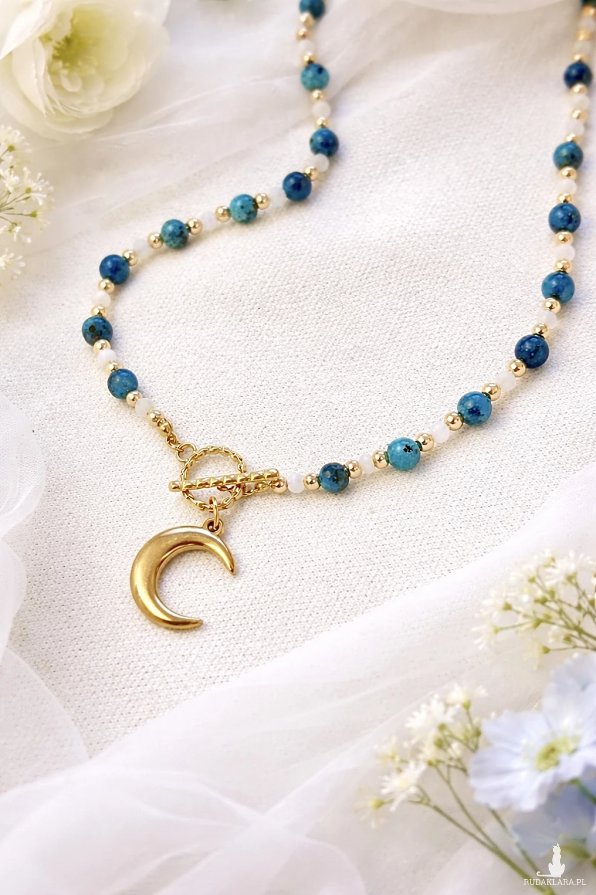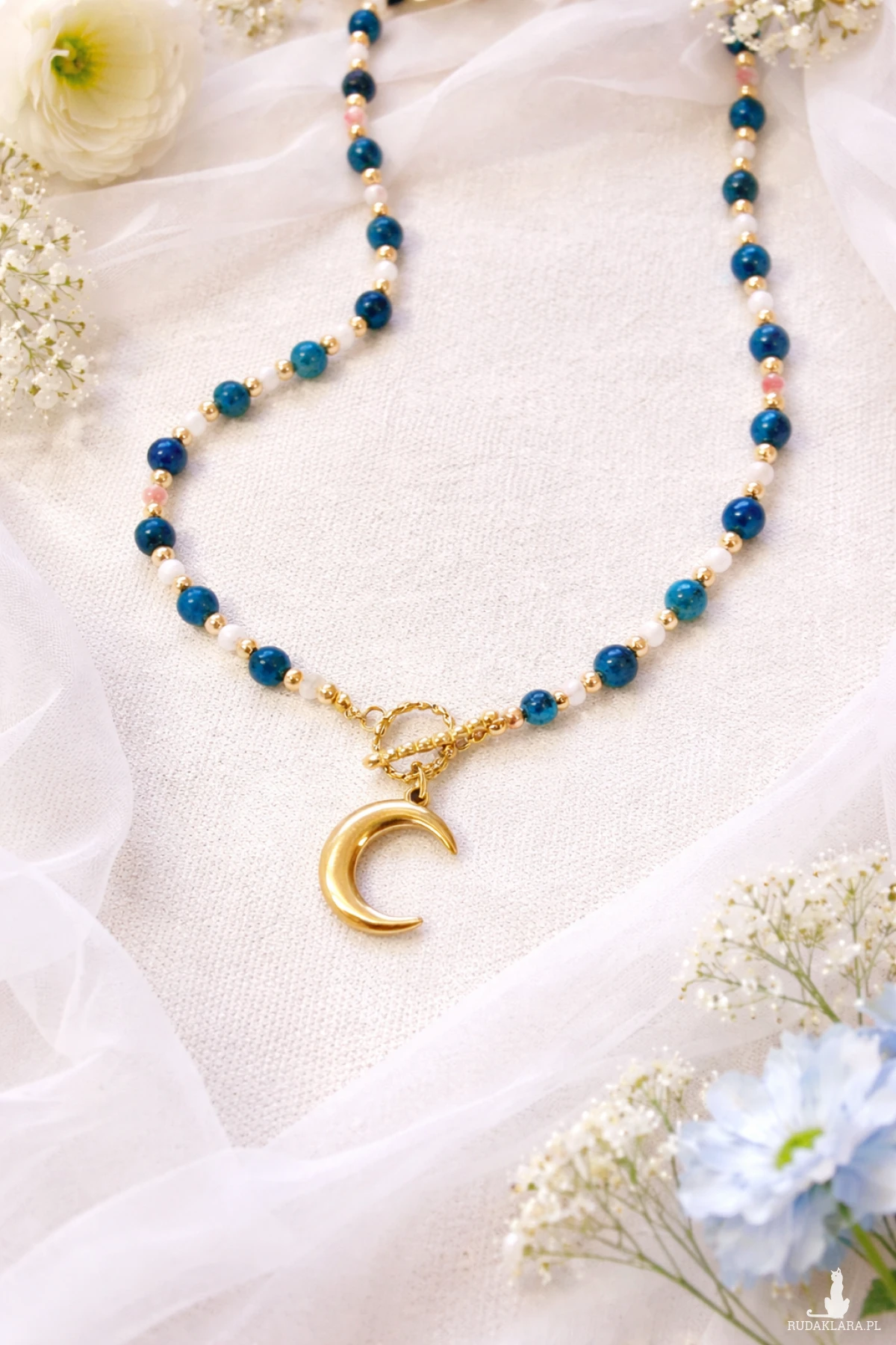 Połączenie apatytu, kamienia księżycowego i hematytu tworzy kompozycję pełną balansu — między świeżością a elegancją, między delikatnością a wyrazistością. Złoty półksiężyc dodaje całości miękkiego, kobiecego akcentu i przyciąga spojrzenia w nienachalny sposób.
