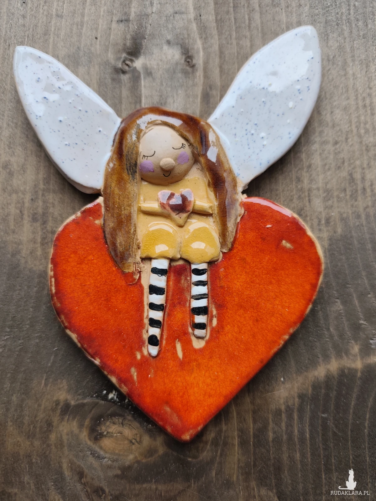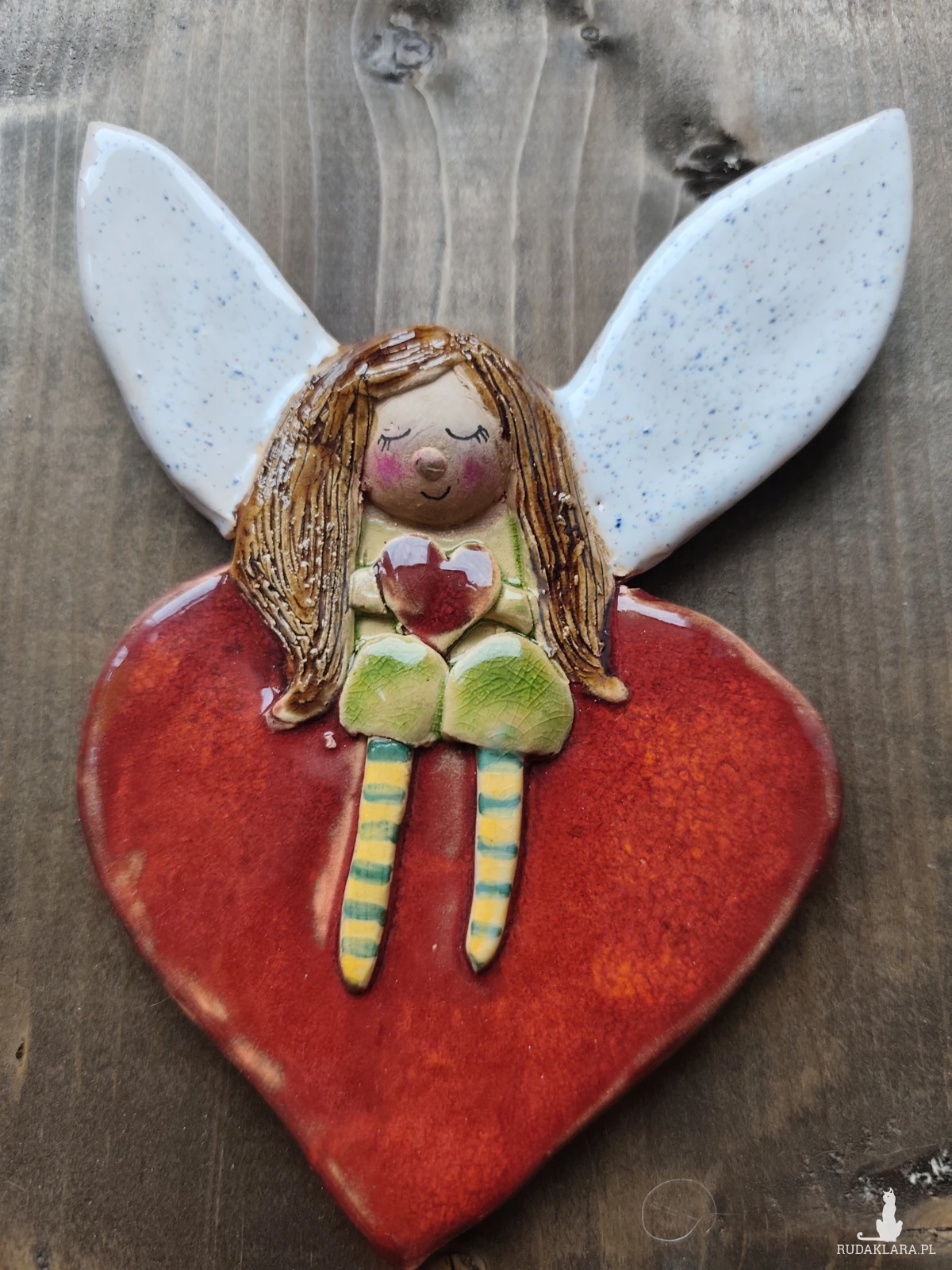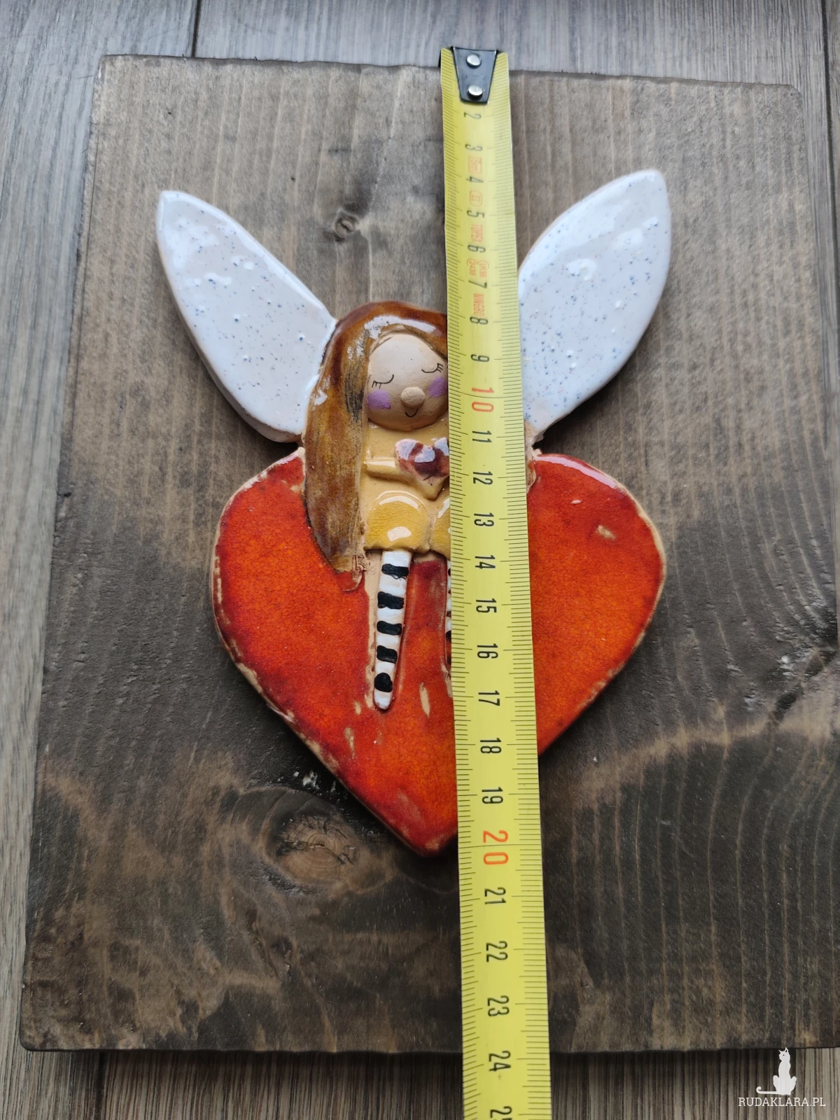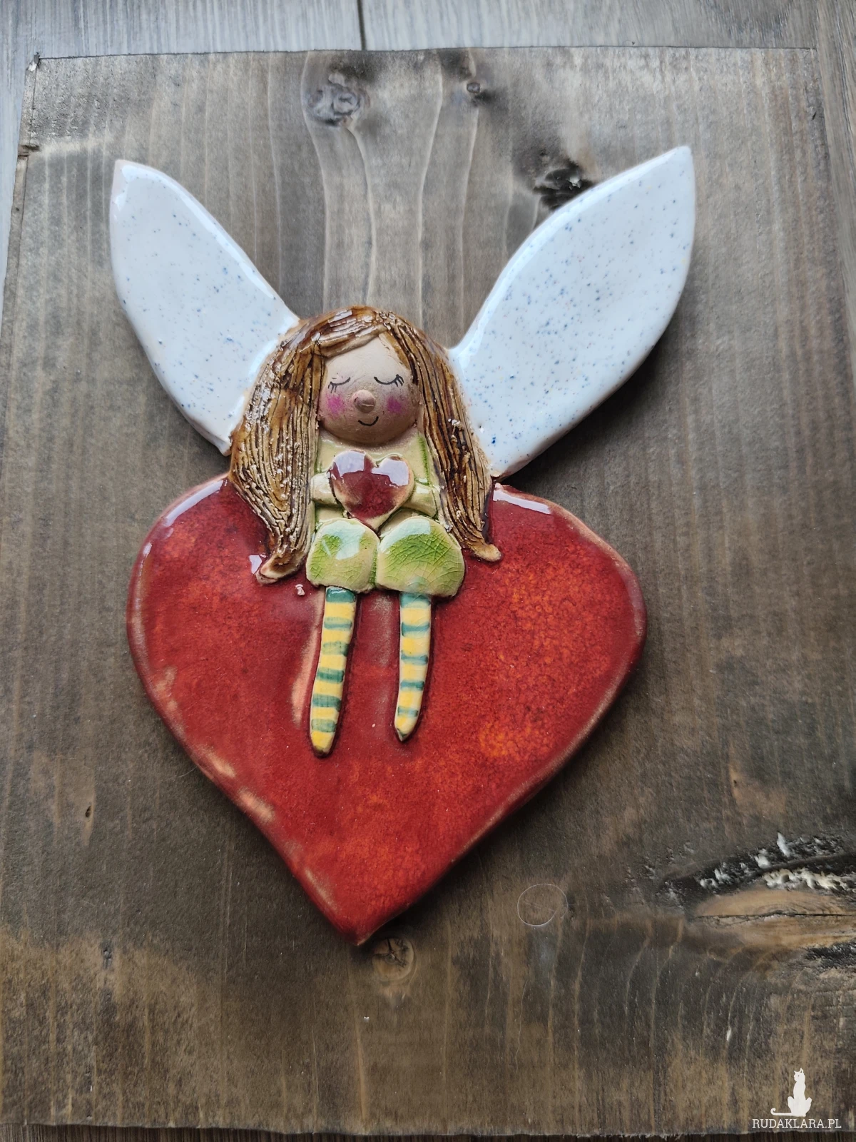 Aniołek ceramiczny ręcznie wykonany umocowany na postarzanej desce. Wykonany z gliny szamotowej, szkliwiony i dwukrotnie wypalany w piecu ceramicznym na wysoka temperaturę. Z tyłu na desce zaczepy do powieszenia na ścianie. Polecam
