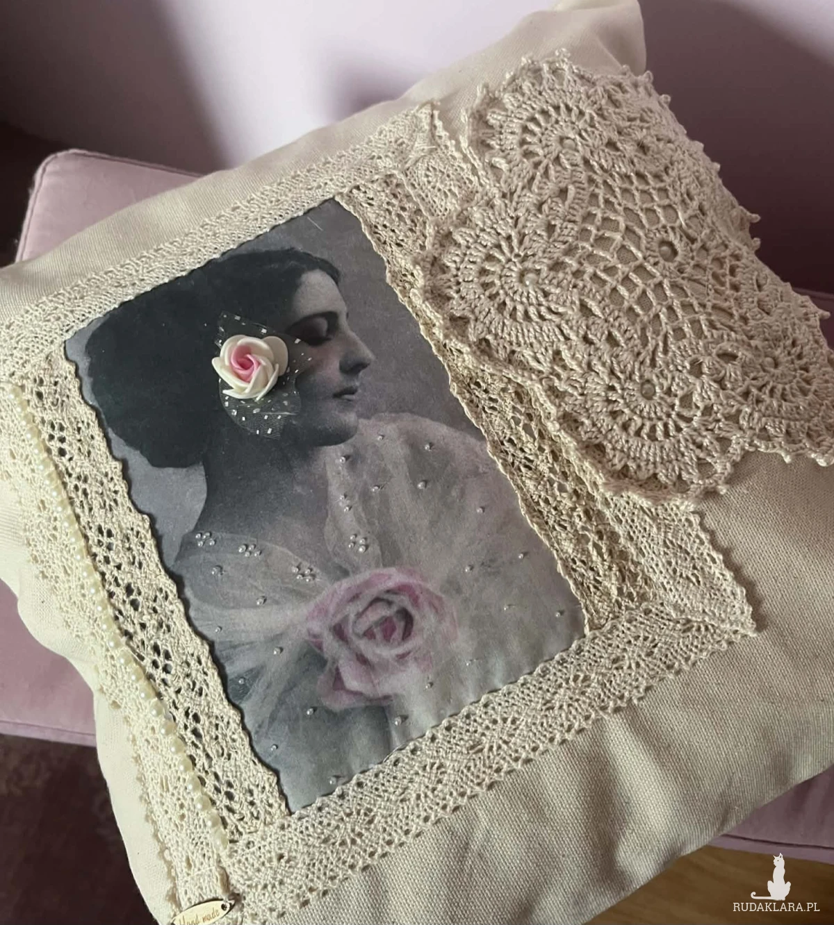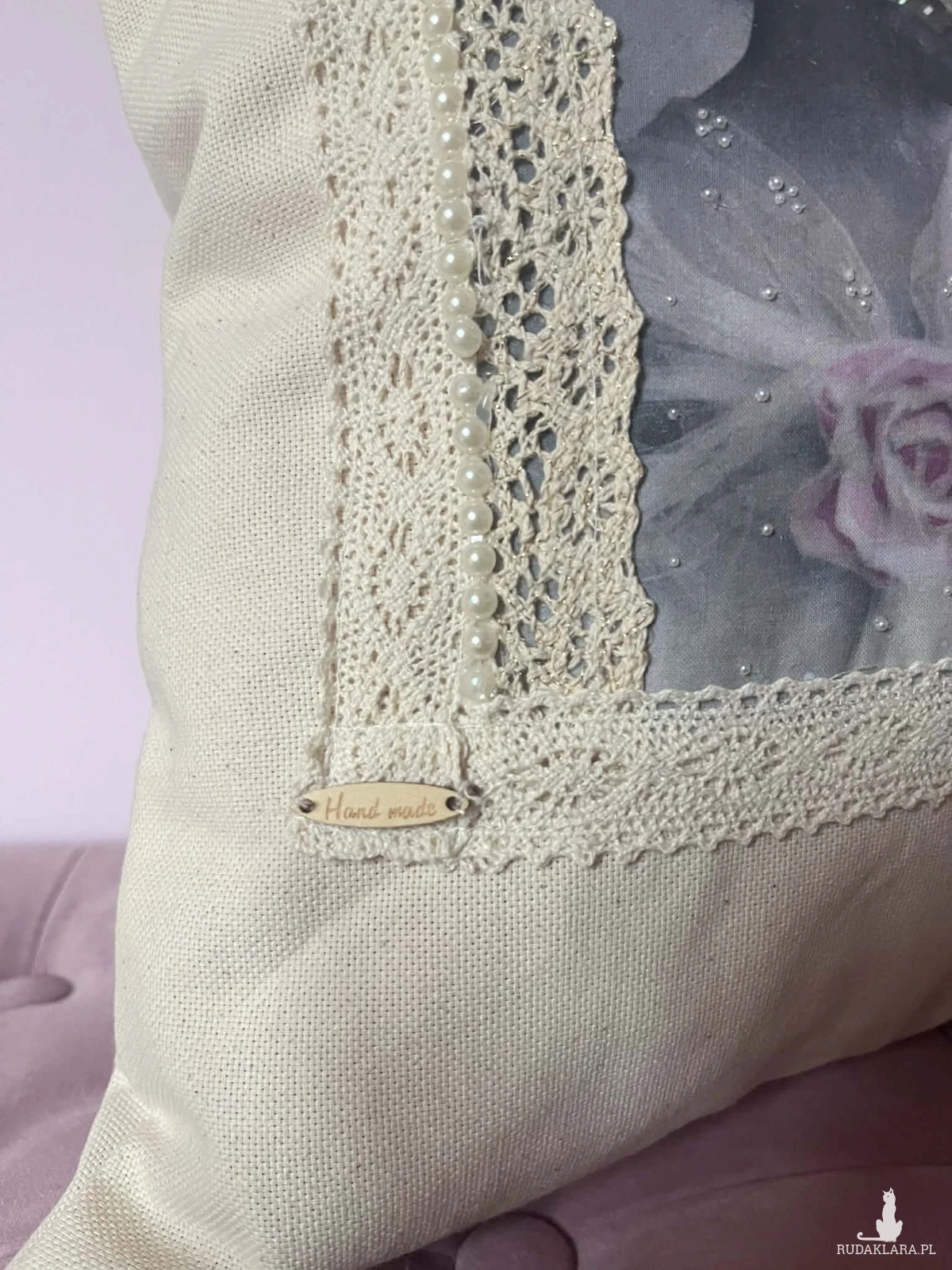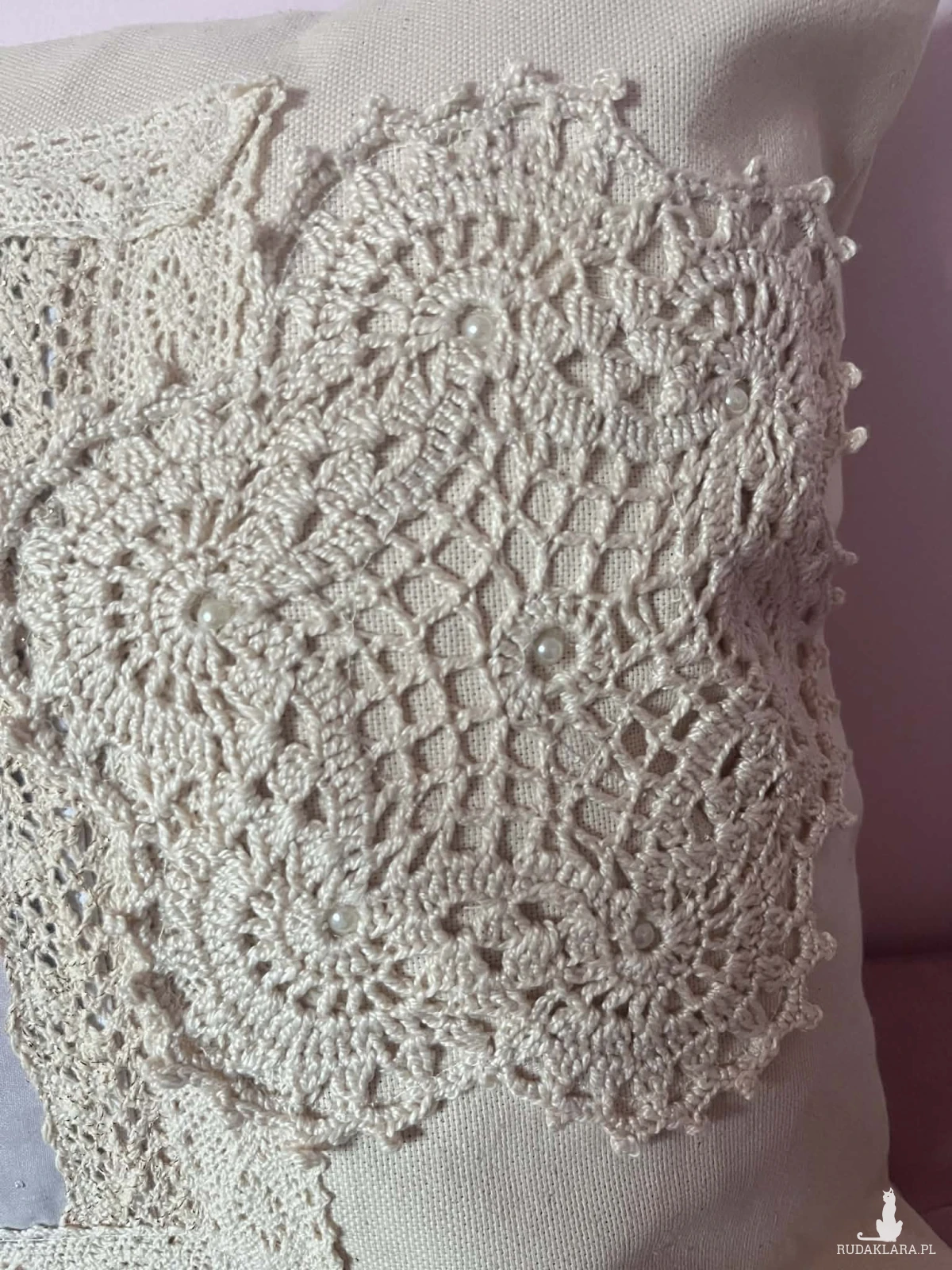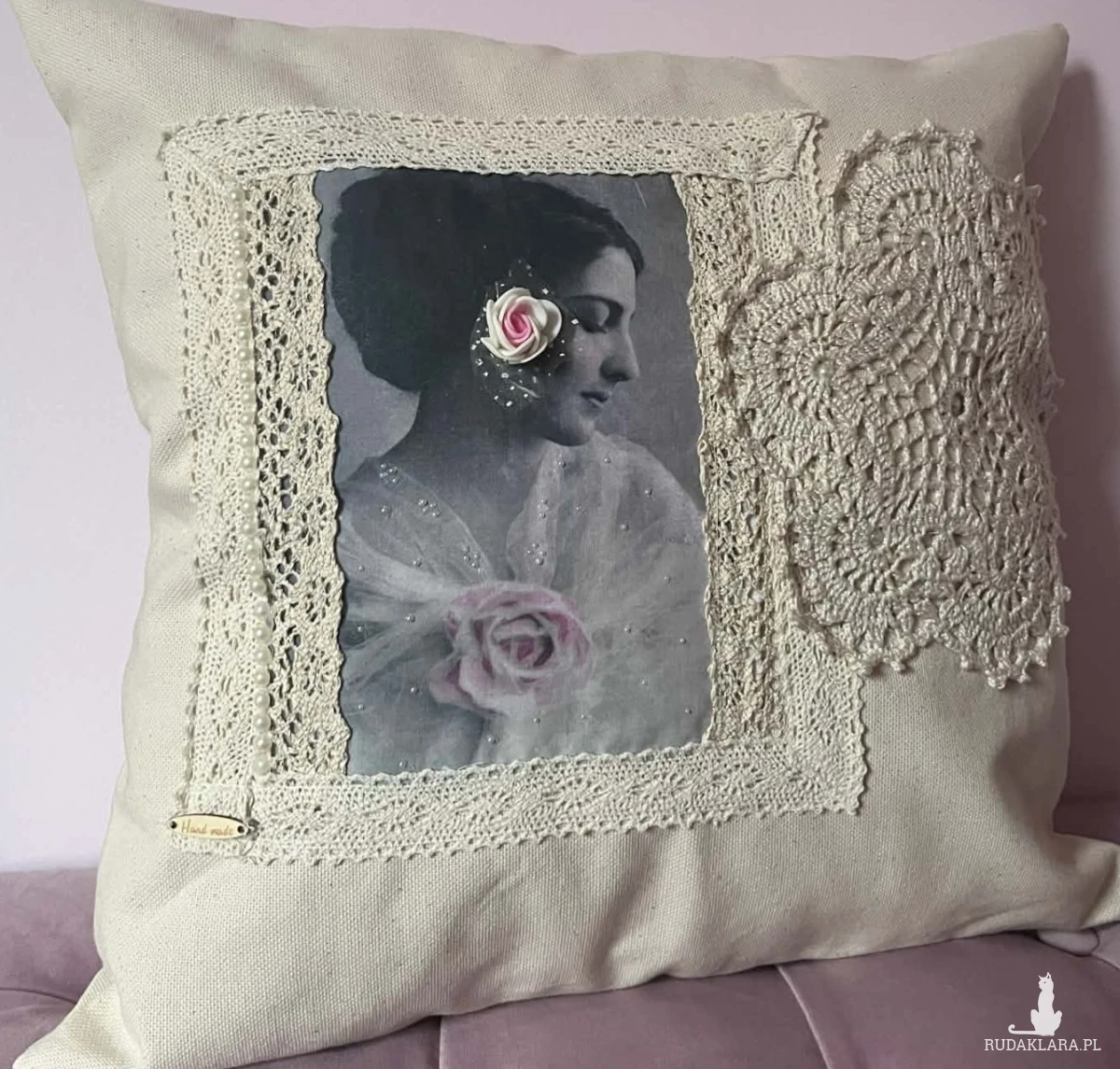Poszewka na poduszkę rozm 40x40cm uszyta z płótna bawełnianego. Zapinana na guziki ozdobiona nadrukiem bawełnianą koronką I szydełkową serwetką. Polecam serdecznie