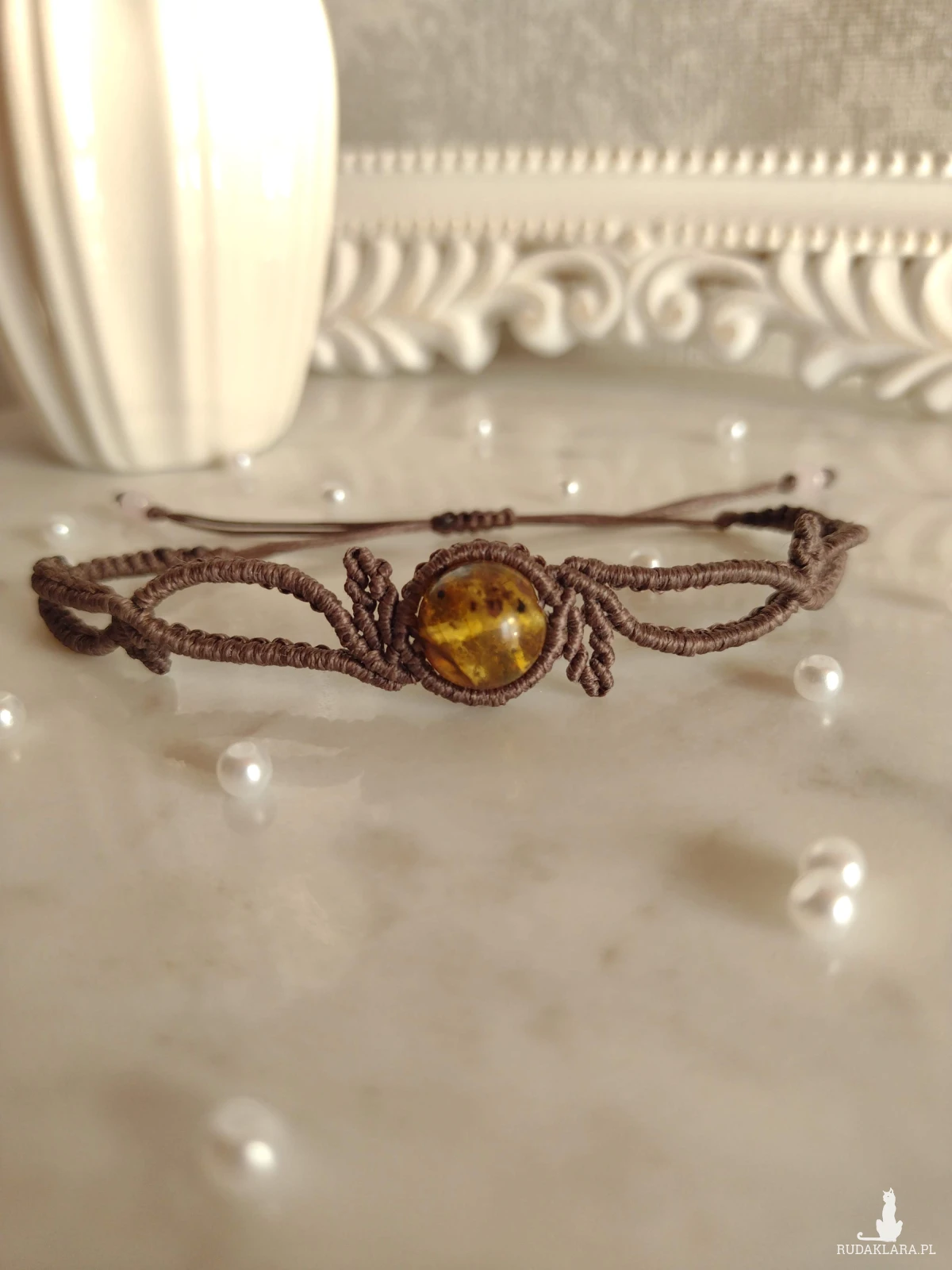 Delikatna, ręcznie wykonana bransoletka w technice mikromakramy, utrzymana w ciepłym odcieniu brązu, który pięknie podkreśla naturalny blask bursztynu. Centralny kamień przyciąga uwagę swoją złocisto-miodową barwą i subtelną grą światła.
