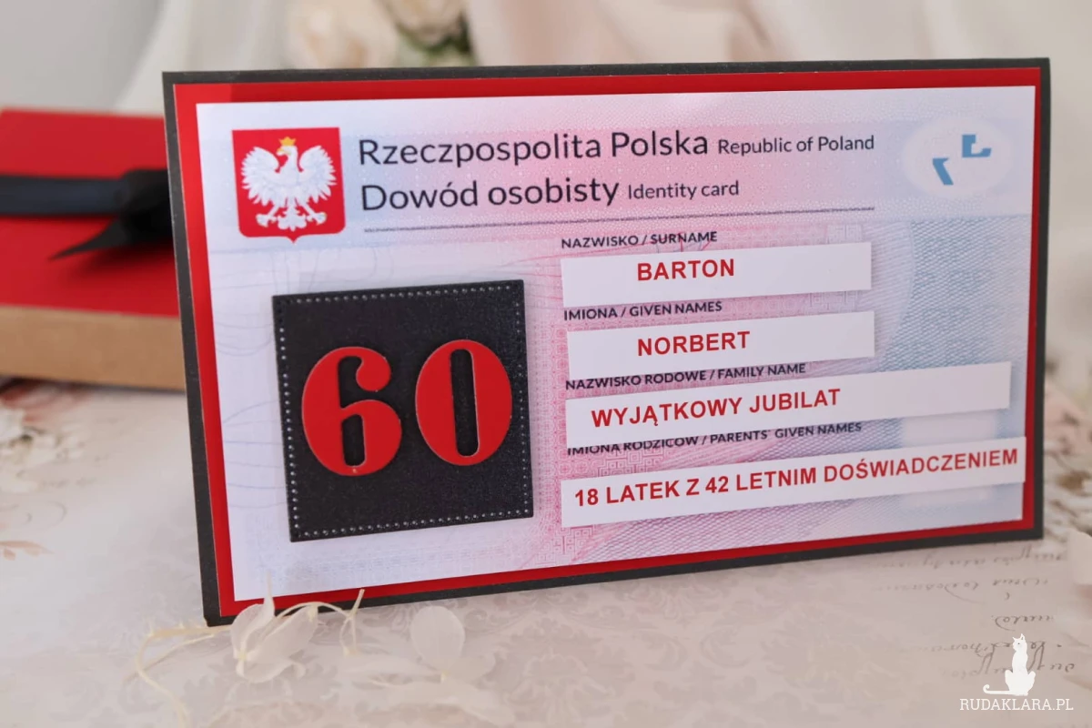 Szukasz prezentu na 60 urodziny dla mężczyzny, który będzie nie tylko zabawny, ale też zapamiętany na długo? Ta ręcznie robiona kartka w formie dowodu osobistego to oryginalny pomysł na prezent, który od razu wywoła uśmiech Jubilata!