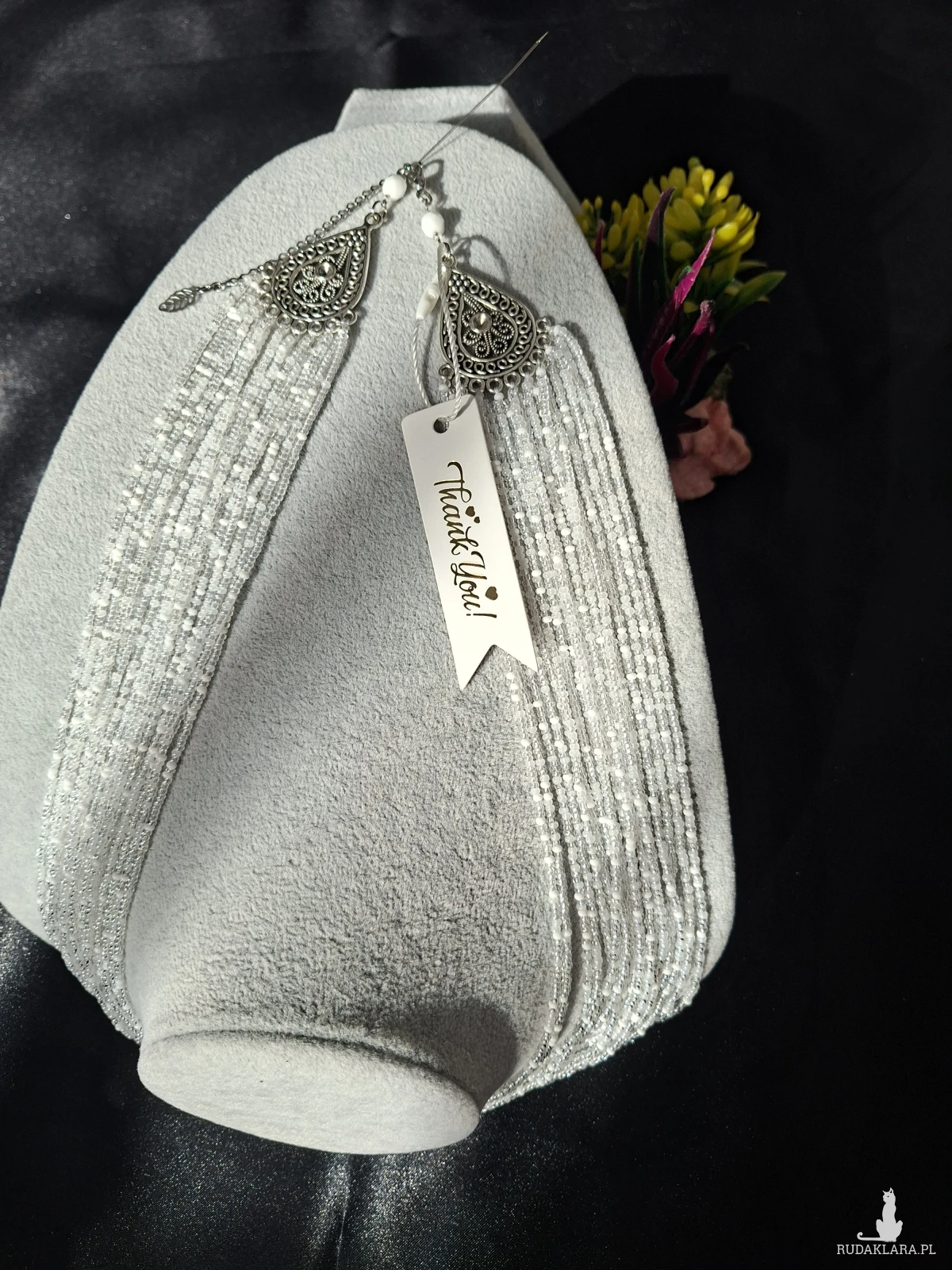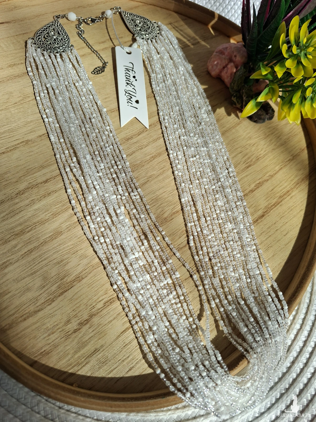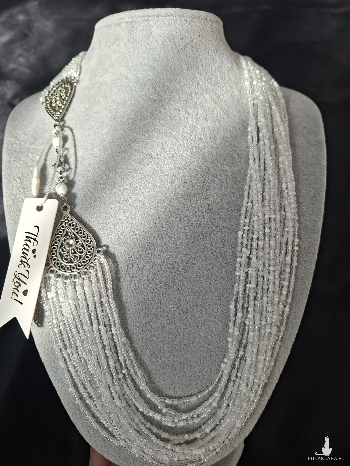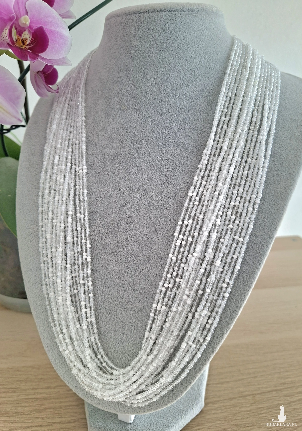 Ten imponujący naszyjnik to kwintesencja elegancji w wydaniu handmade. Skonstruowany z kilkunastu lśniących sznurów drobnych koralików, tworzy efektowną kaskadę, która pięknie rozświetla dekolt i dodaje szyku każdej stylizacji.