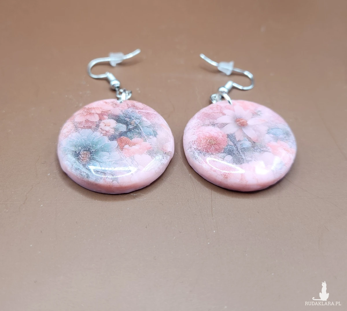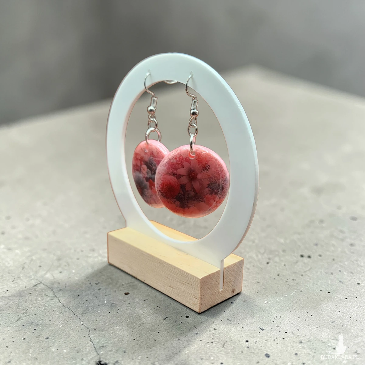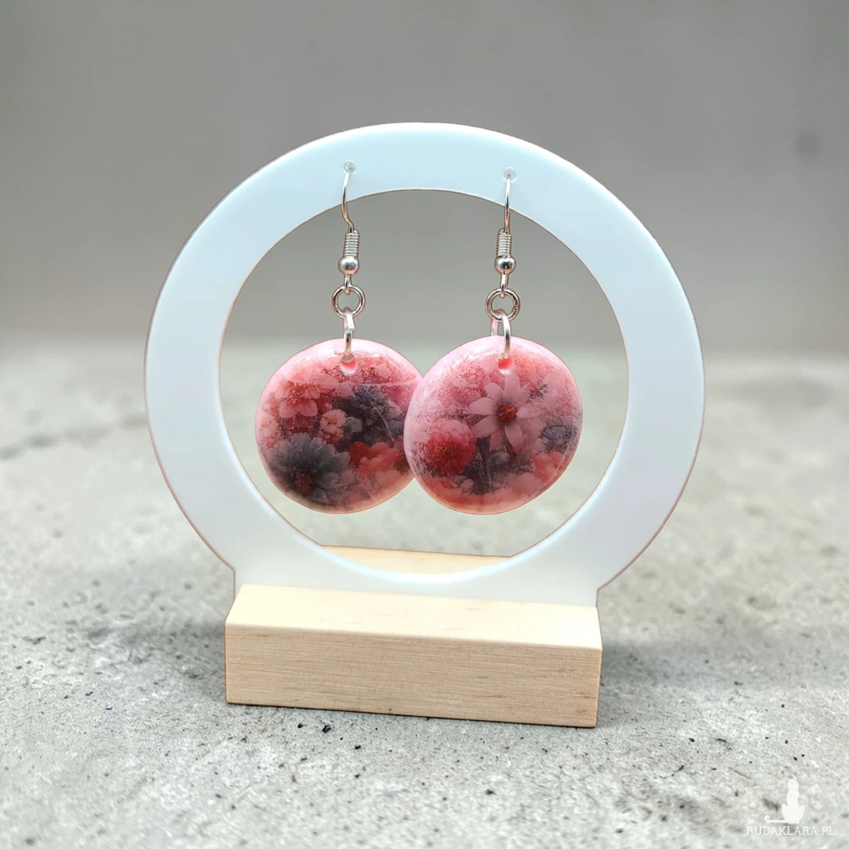 Oferuję ręcznie wykonane kolczyki, stworzone z gliny polimerowej i zalane transparentną żywicą, która nadaje im wyjątkową głębię i piękny połysk. W środku zatopione są delikatne kompozycje kwiatowe w odcieniach różu i czerwieni – każdy egzemplarz jest niepowtarzalny.