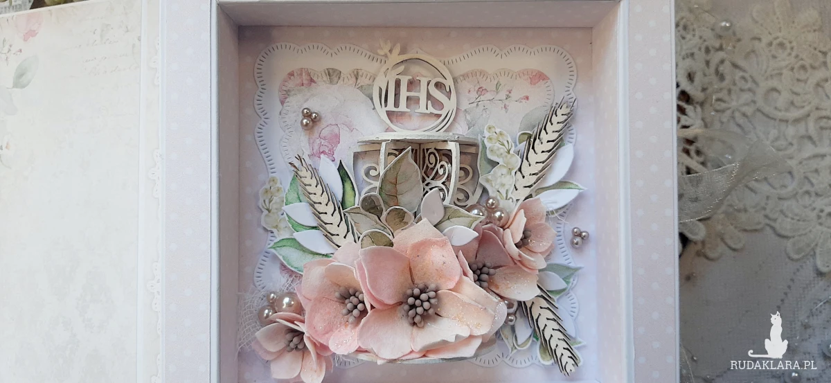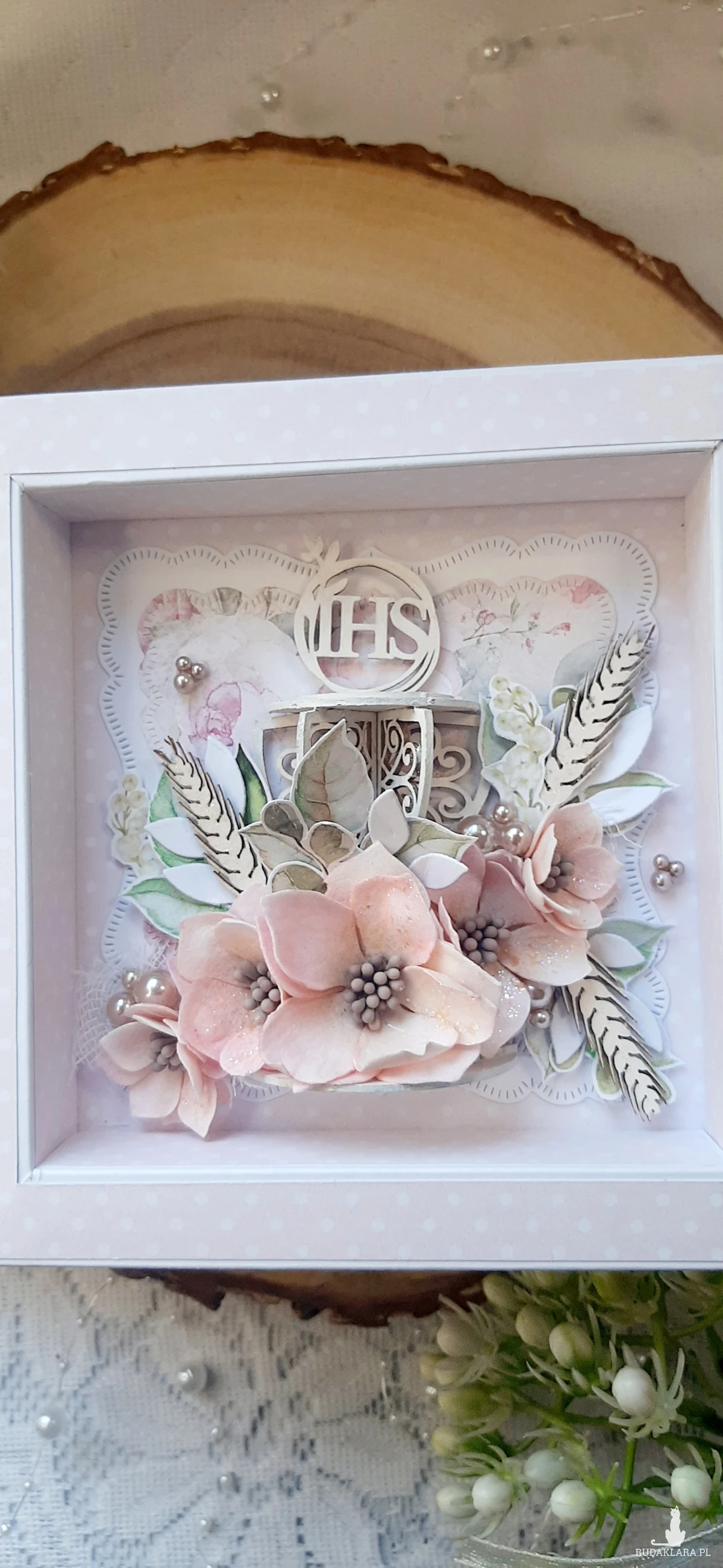 Komunijny Shadow Box dla dziewczynki. W środku kartka podklejona taśmą dwustronną na życzenia, którą można przykleić na wewnętrznej stronie wieczka. Wymiary boxa to 14x14x2,5 cm. Będzie nietuzinkowym prezentem i fajną pamiątką.