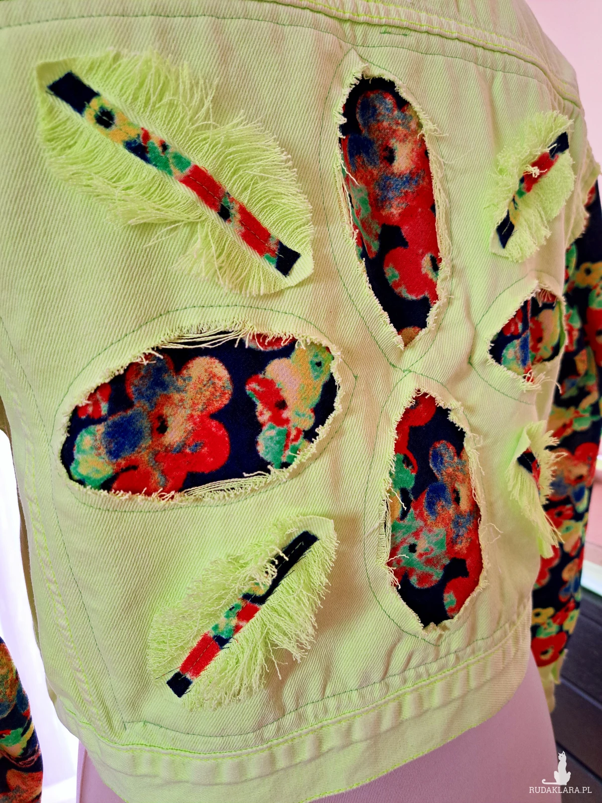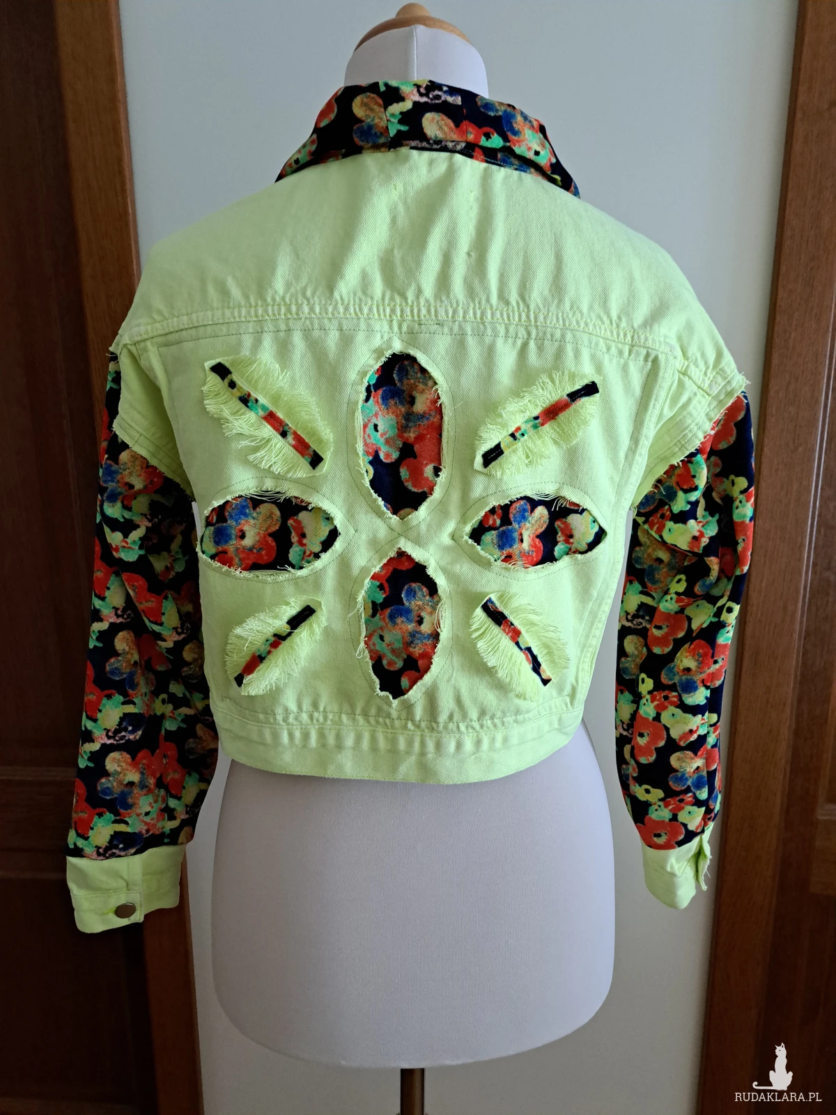 Sprzedam kolejne moje dzieło z serii nic nie może być nudne!!! Krótka jaskrawa kurtka z misterny wyciętym kwiatem, z dodatkiem super dobranej tkaniny i na rekawach i kołnierzu.Wszystko 100 % mój projekt,jedyna! . Piękna i unikatowa na każdą okazję!!!. Bardzo polecam! Długość 41 między pachami 2x50 POLECAM jedyna taka dla Ciebie 🙂 DAJĘ RZECZOM DRUGIE ŻYCIE
