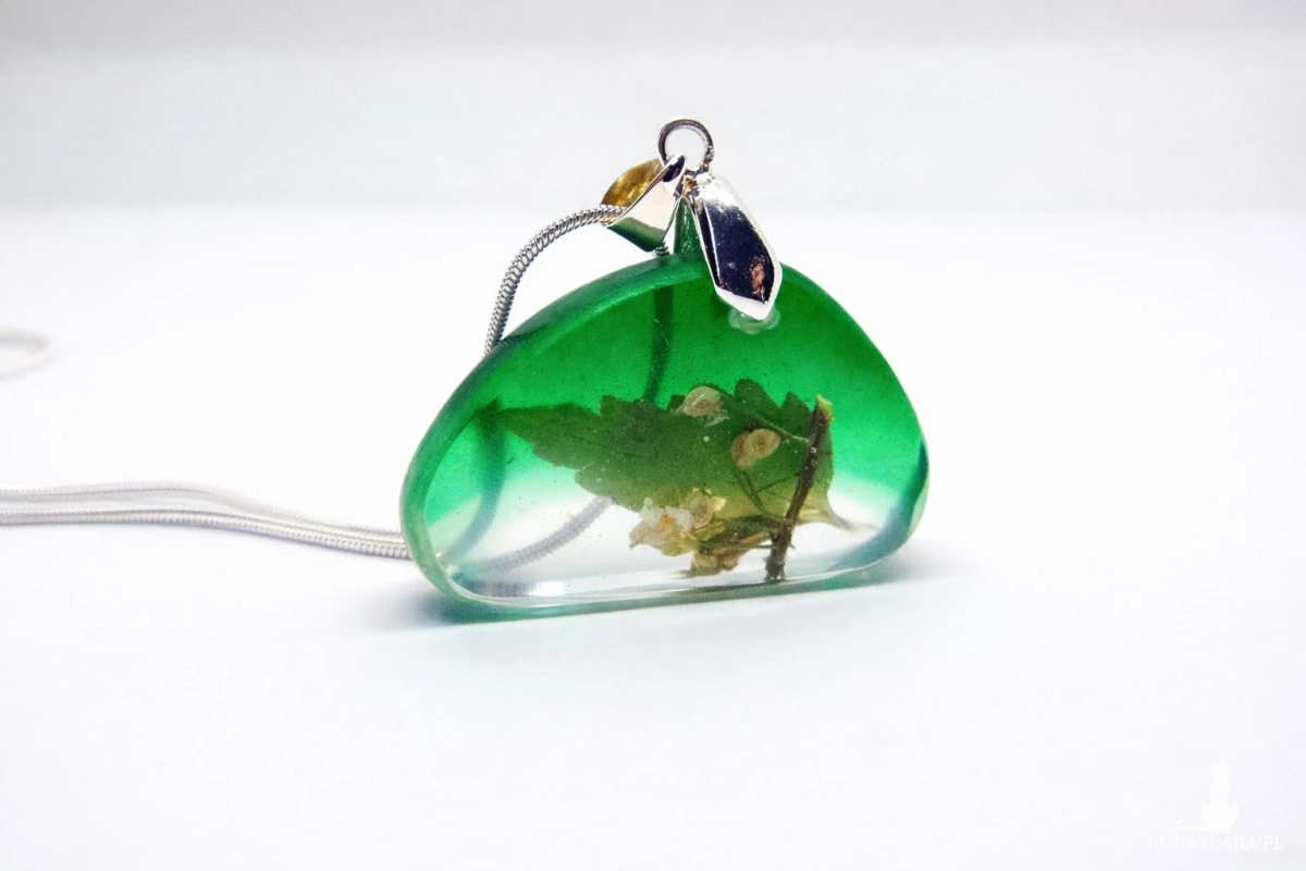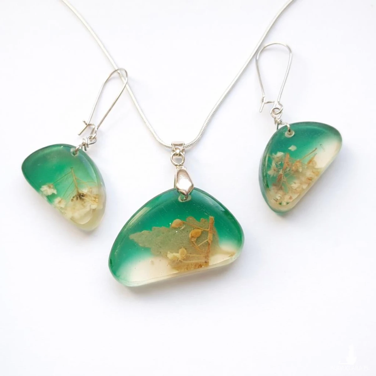 Wyjątkowy komplet biżuterii handmade wykonany z transparentnej zielonej żywicy epoksydowej, w której zostały zatopione prawdziwe liście pokrzywy. Każdy zestaw tworzony jest ręcznie, dzięki czemu stanowi niepowtarzalną ozdobę inspirowaną naturą.