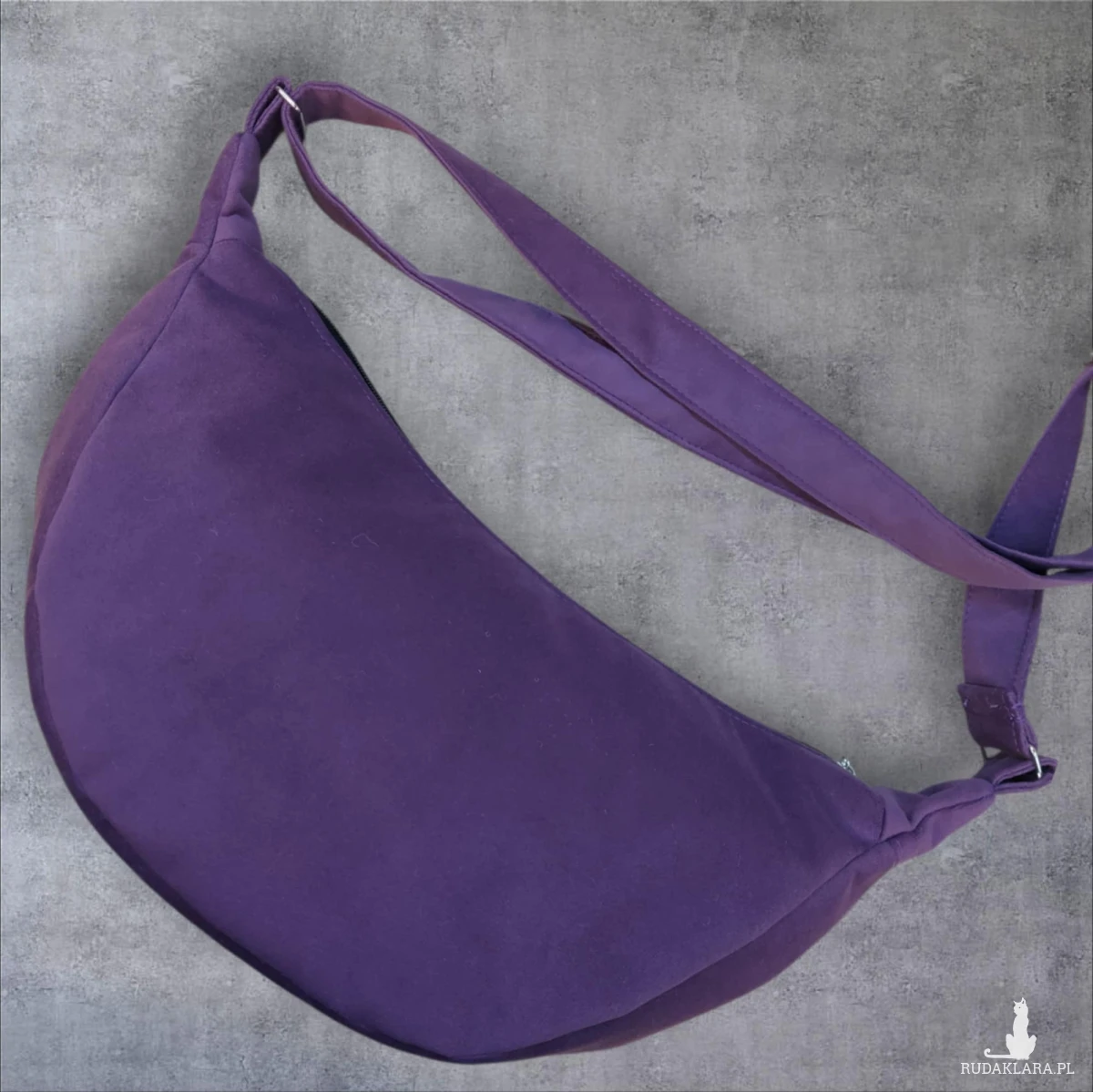 Uszyta z fioletowego weluru oraz printu wodoodpornego i ekoskóry, w środku czarna podszewka. Pasek z weluru o szerokości 3cm.