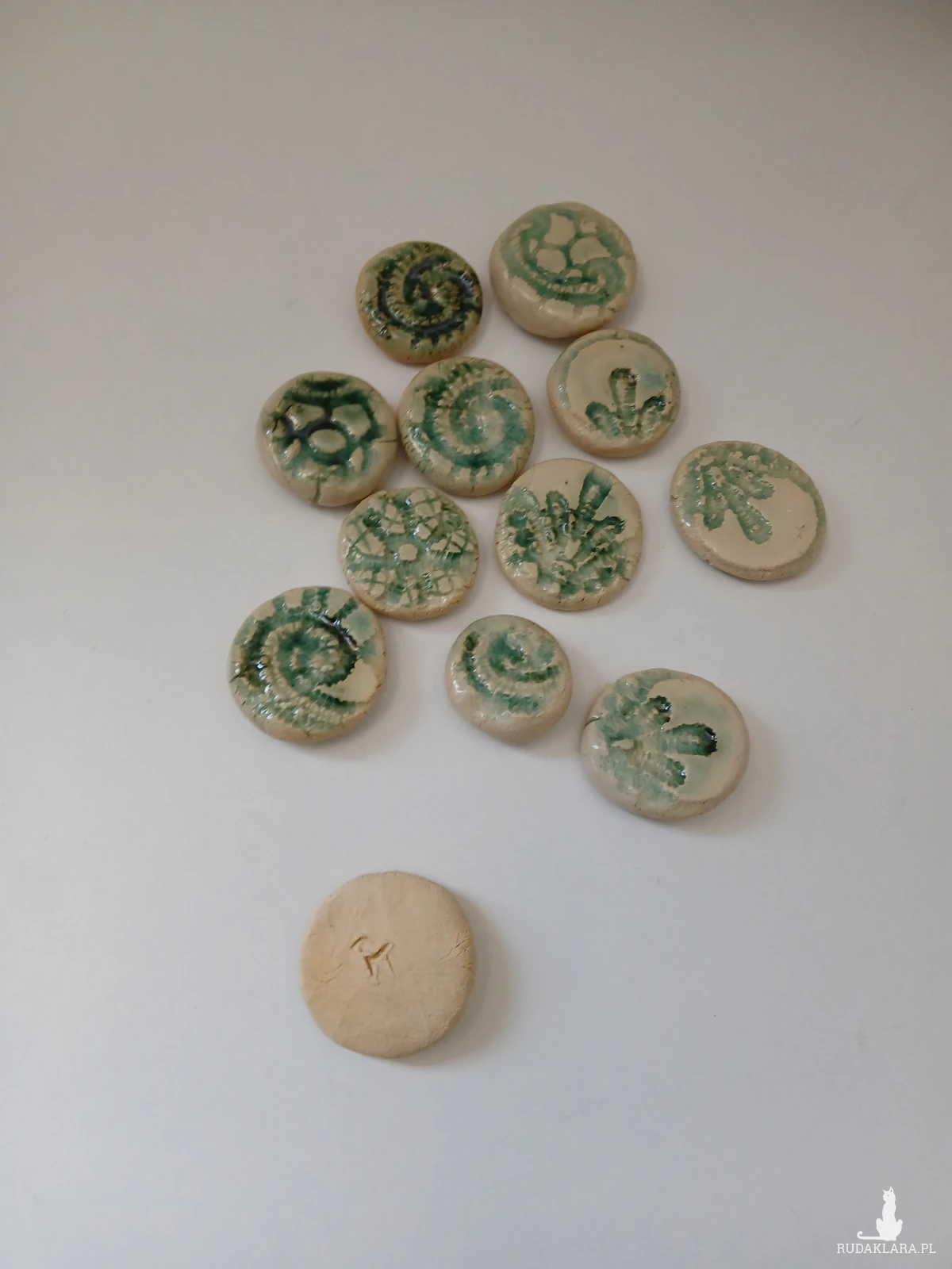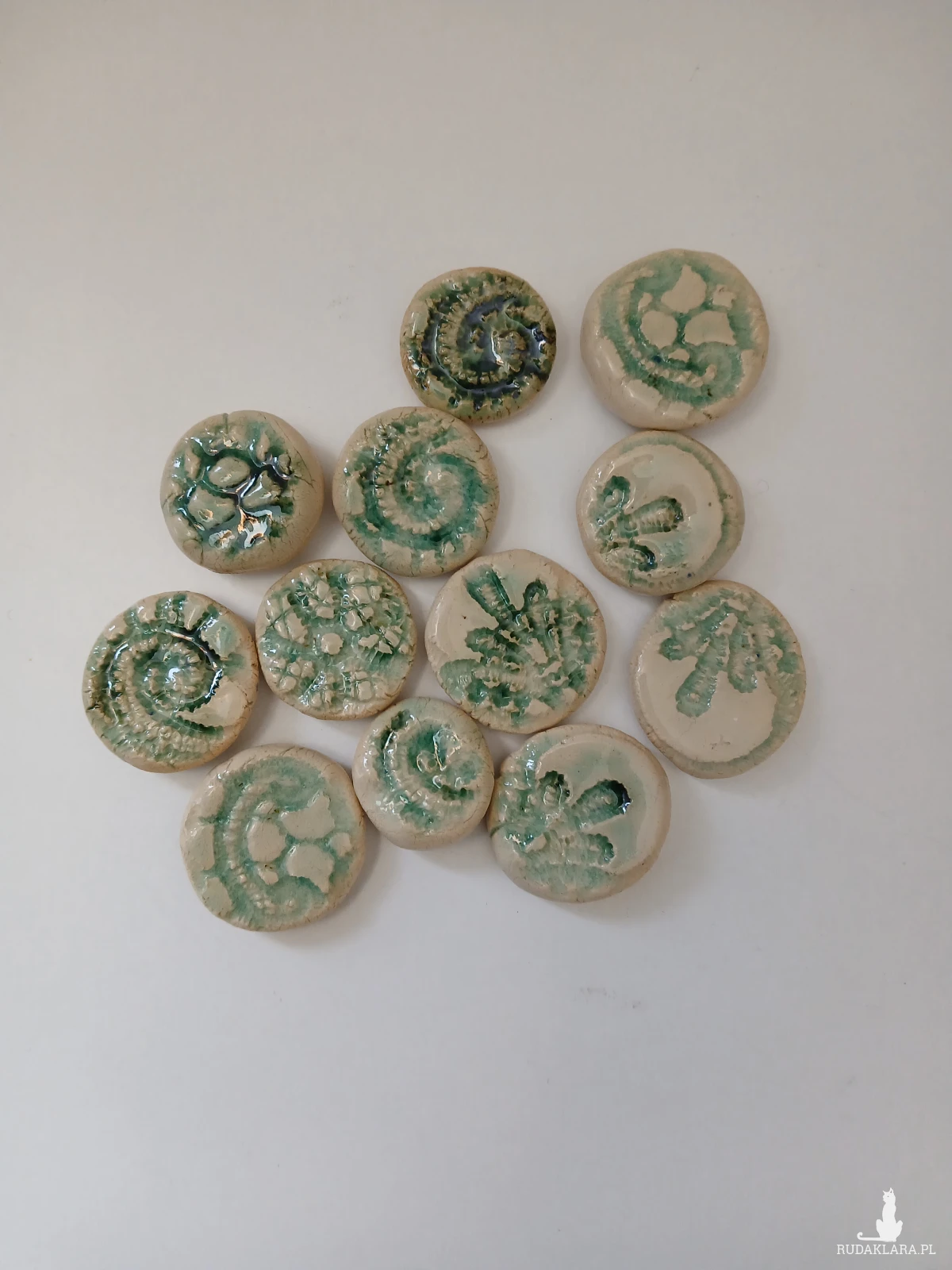 Ceramiczne kamyki dekoracyjne z odciśniętym wzorem skamieliny skamieniałości. Można użyć do dekoracji akwarium czy ogrodu lub jako element do tworzenia biżuterii, można je oprawić lub przykleić do zapięcia do broszki. Naklejone na deskę stworzą niezwykłą mozaikę lub mandalę.