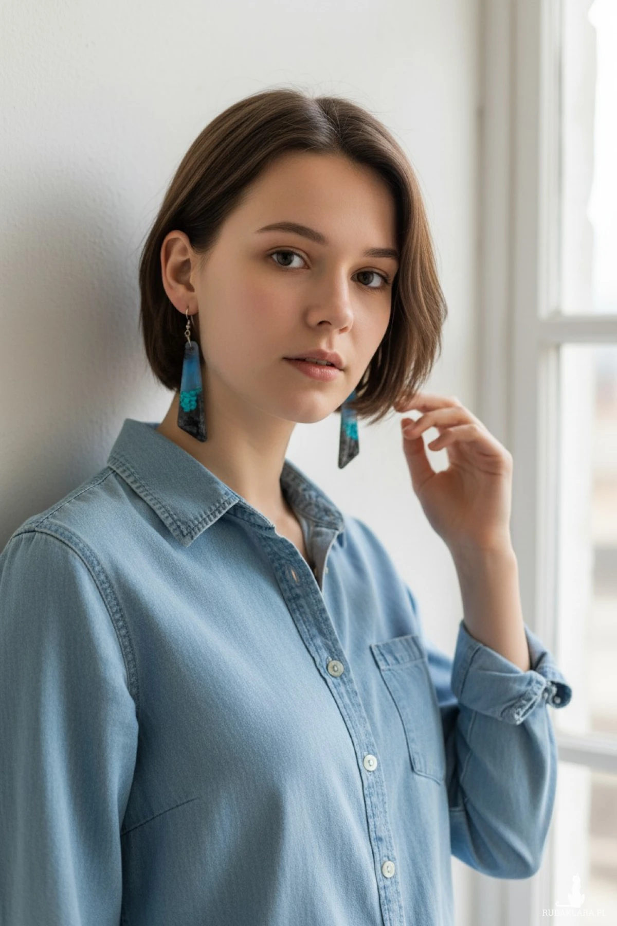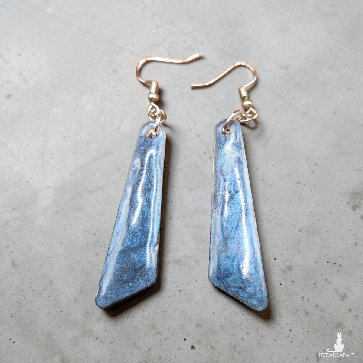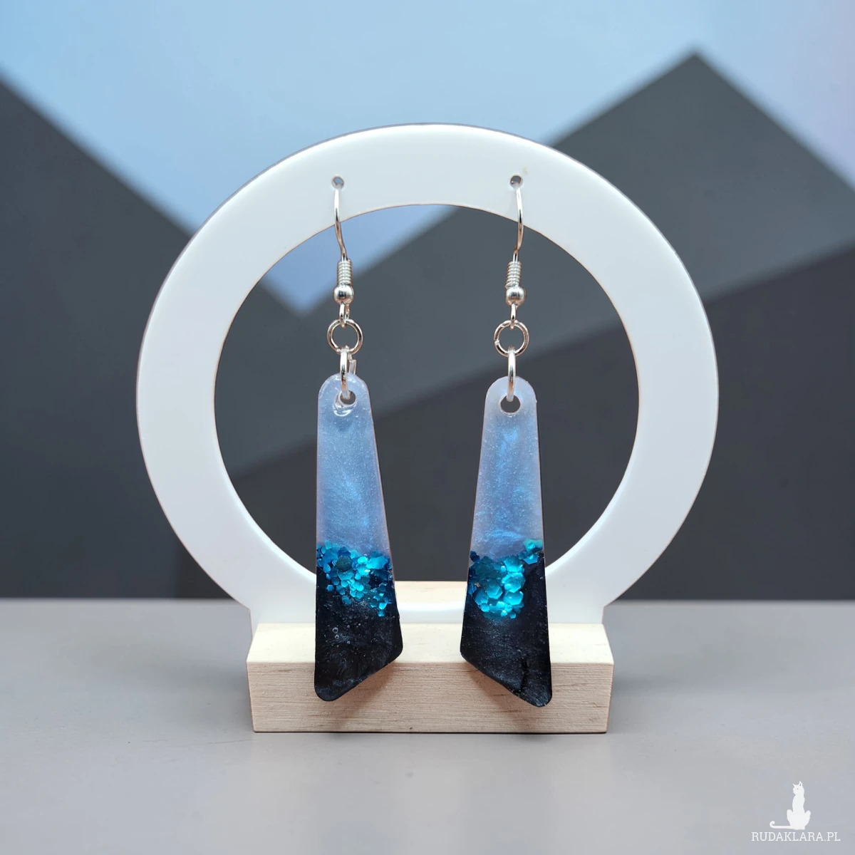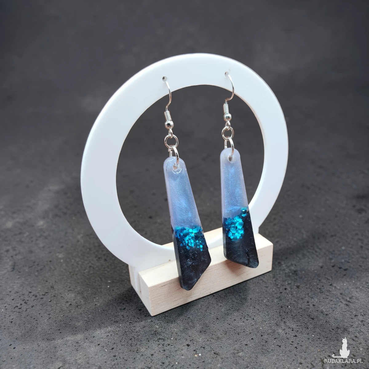Kolczyki zachwycają wyjątkowym przejściem kolorów – od delikatnego, półtransparentnego błękitu po głęboki, ciemny dół z zatopionymi, mieniącymi się drobinkami przypominającymi morskie kryształki. Efekt zmienia się w zależności od światła, co jest charakterystyczne dla biżuterii z żywicy .