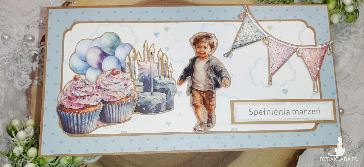 Kartka okolicznościowa, ręcznie wykonana metodą scrapbooking na bazie kraftowej. Kartka do koperty. Oklejona z każdej strony. W środku znajduje się kartka podklejona taśmą dwustronną na życzenia. Mogę też wydrukować życzenia. Wymiary kartki to 20,5x10,5 cm. W zestawie z kopertą kraftową.