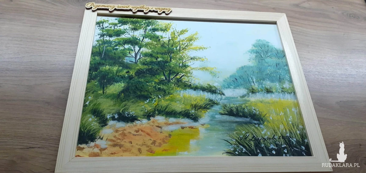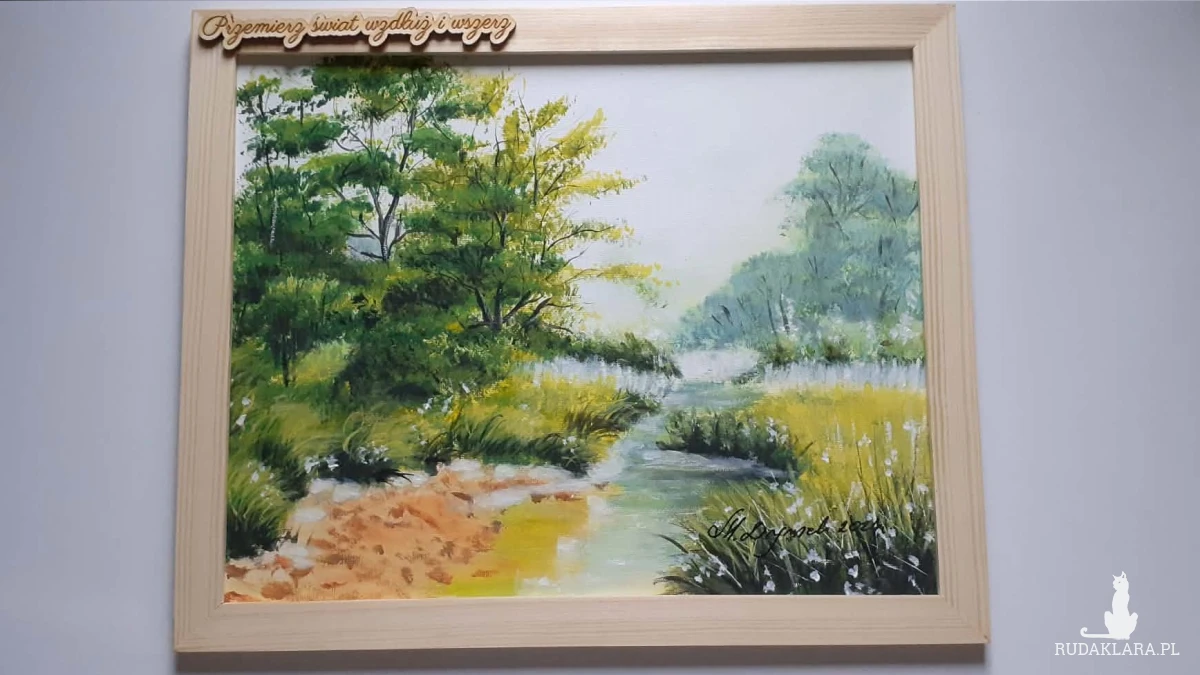Obraz duszą malowany, gotowy na prezent pejzaż w ramie. Wprowadzi do wnętrza spokój, świeżość, ciepłą estetykę i odrobinę magii. Pięknie wypełni i udekoruje ściany salonu, sypialni, czy gabinetu dodając wnętrzom intrygującej elegancji.