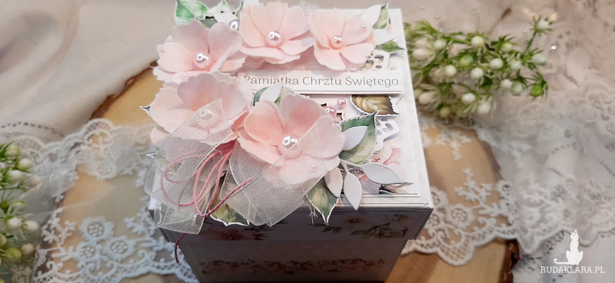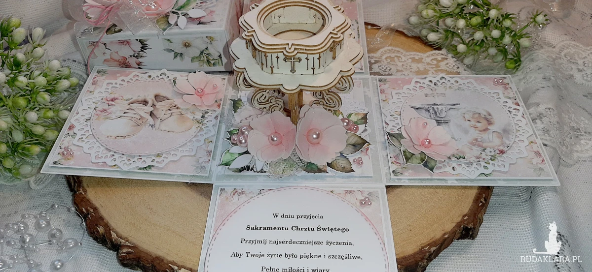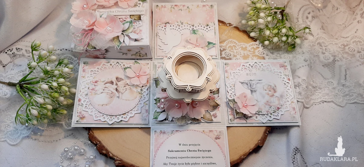 Exploding Box na Chrzest dla dziewczynki. Będzie fajną pamiątką. W środku znajduje się kieszonka na pieniążki. Na kółku z życzeniami na górze jest miejsce na wpisanie imienia dziecka a nadole na podpis osoby wręczającej. Wymiary zamkniętego boxa to około 10,5x10,5 cm. Po rozłożeniu 30x30 cm.