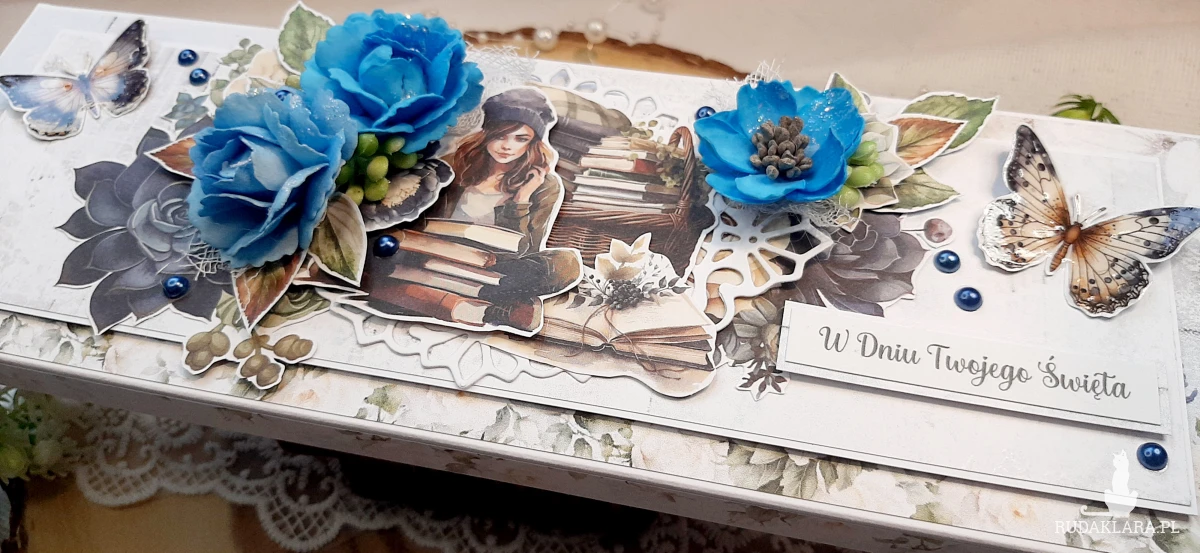 Czekoladownik czyli ozdobne pudełko na czekoladę o wymiarach 27x9,3x1,5 cm. Zmieści się do niego czekolada duża Milka. W środku mogę umieścić karteczkę na życzenia i kopertę na pieniążki.