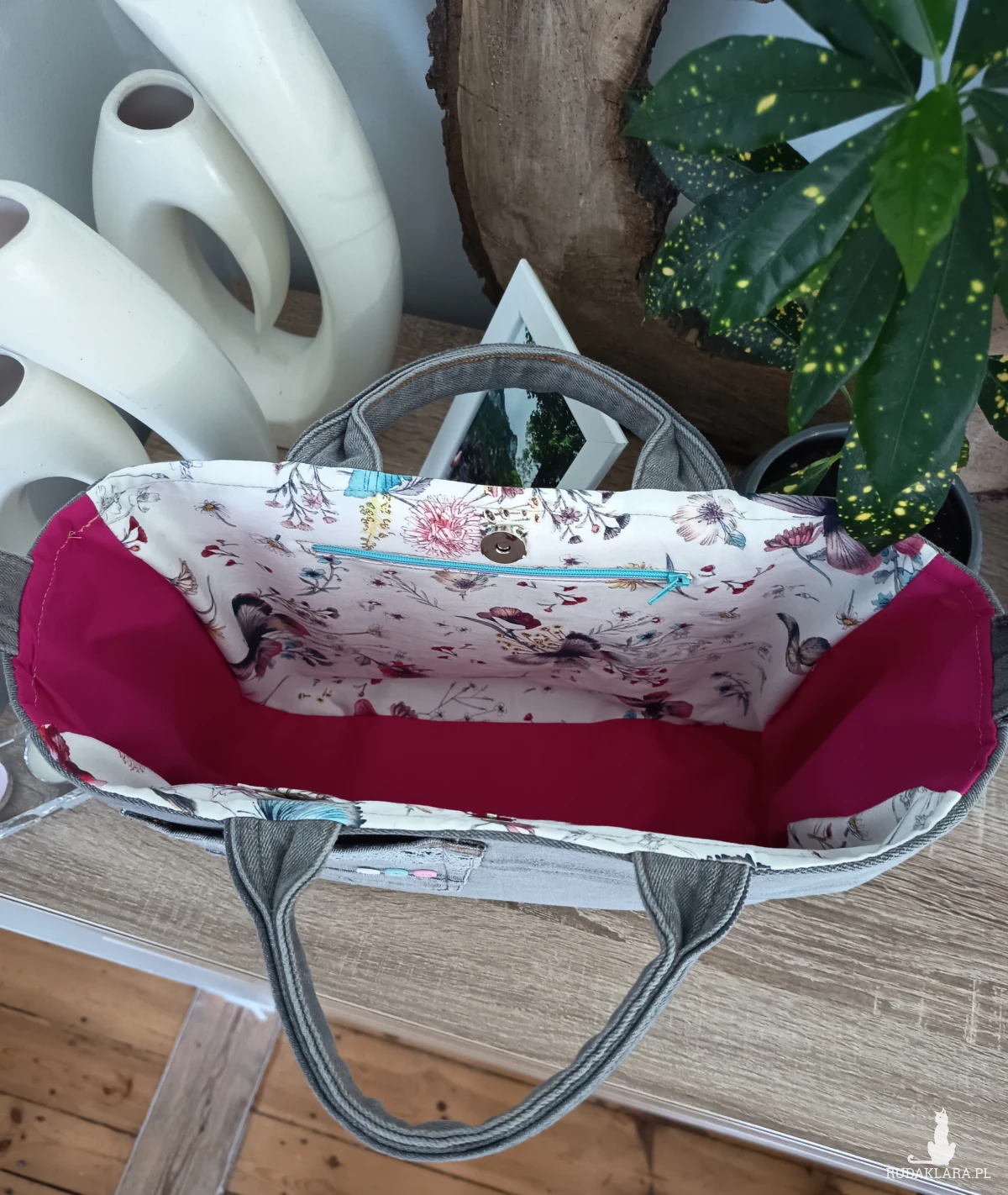 Wnętrze wykończone bawełnianą podszewką, wyposażone w dwie kieszonki, w tym jedną zapinaną na zamek – idealną na drobiazgi. Torebka zamykana jest na wygodny zatrzask magnetyczny.