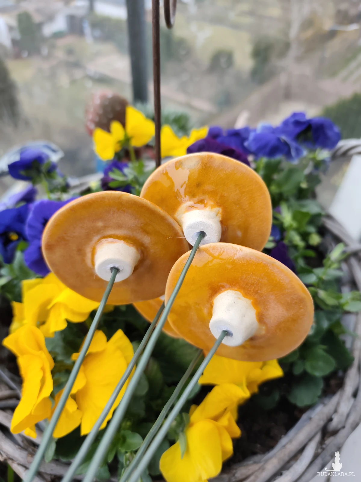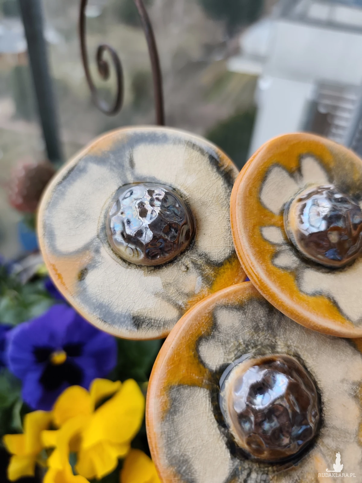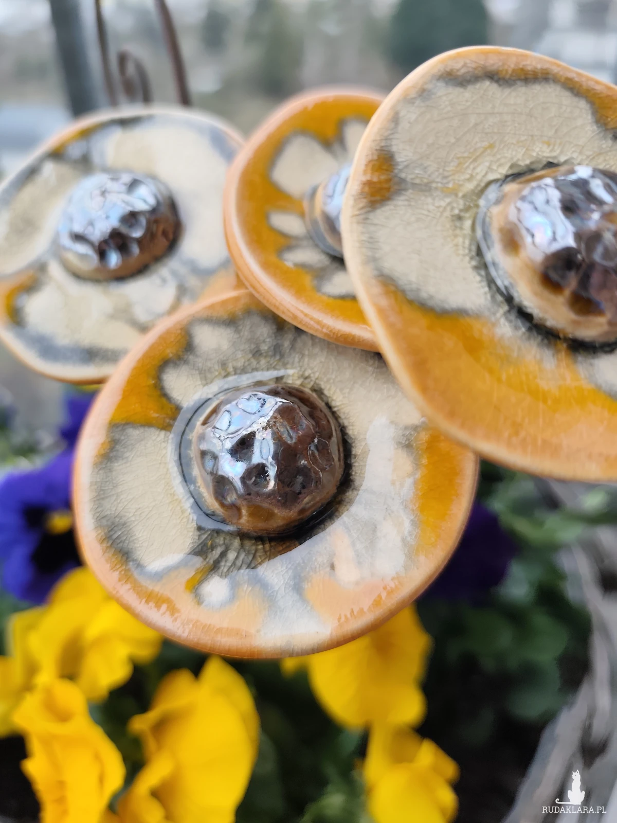Kwiaty ceramiczne 5 szt, wykonane ręcznie z gliny szamotowej, szkliwione i dwukrotnie wypalane w piecu ceramicznym na 1050 stopni. Polecam do domu, na balkon lub do ogrodu. Średnica około 6 cm. Nie przekwitają :)