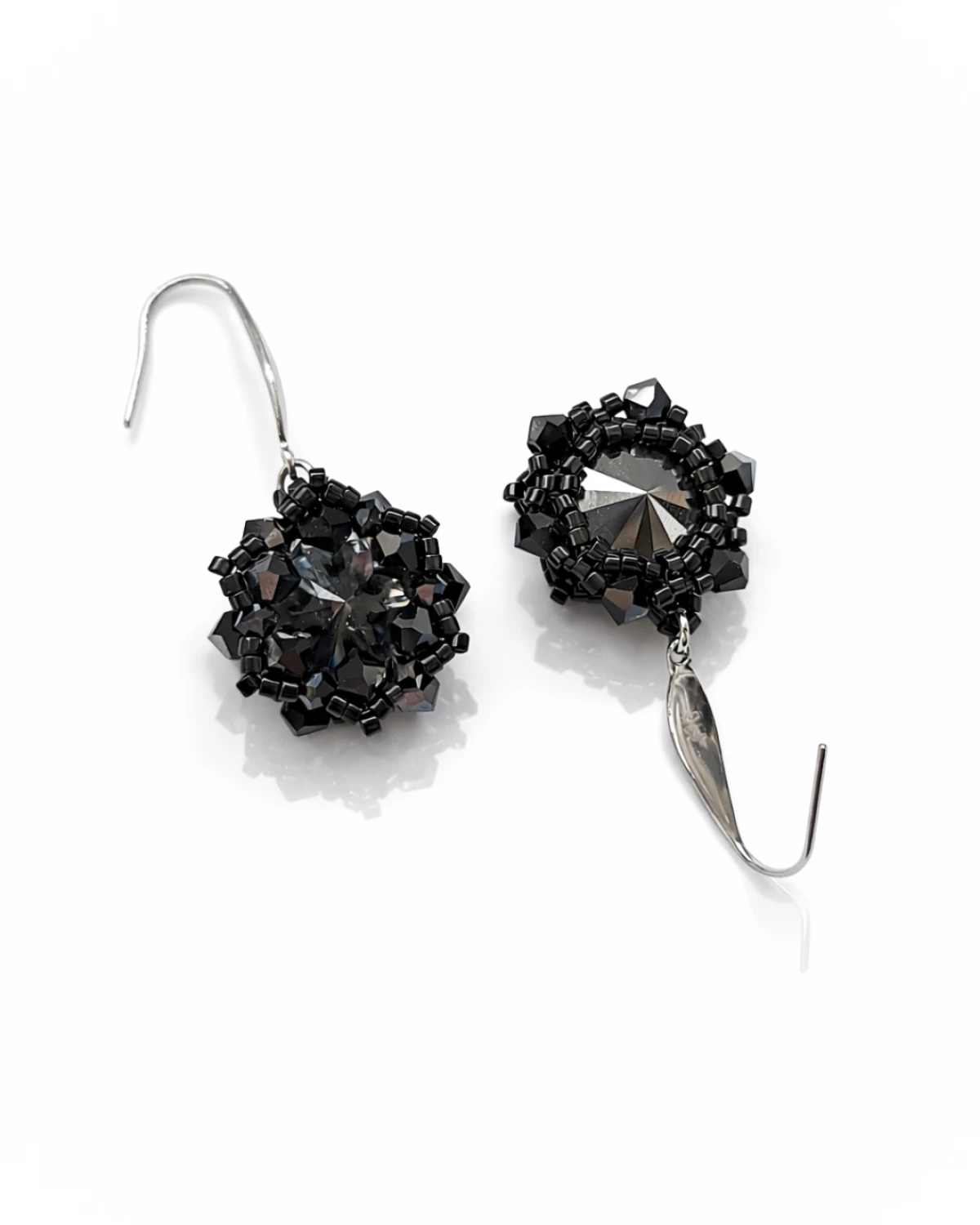 Centralnym elementem każdego kolczyka są kryształy Preciosa Rivoli Maxima w kolorze Night Fall – hipnotyzujące swoją głębią, z delikatnymi refleksami grafitu i srebra, które pięknie odbijają światło przy każdym ruchu.