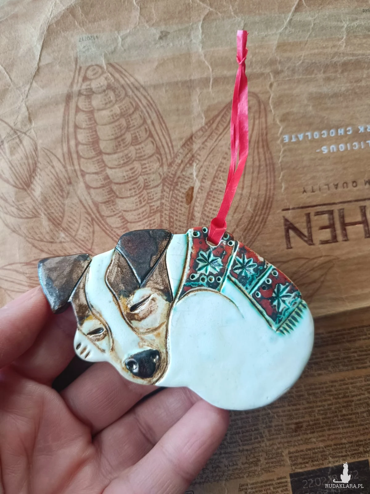 Zawieszka ceramiczna z podobizną pieska rasy Jack Rusell Terrier wykonana z gliny szamotowej, wypalona na biskwit, a następnie szkliwiona w temp. ok 1260 stopni C. Wymiary ok 5 cm x 8,5 cm. Polecam serdecznie wszystkim miłośnikom JRT.
